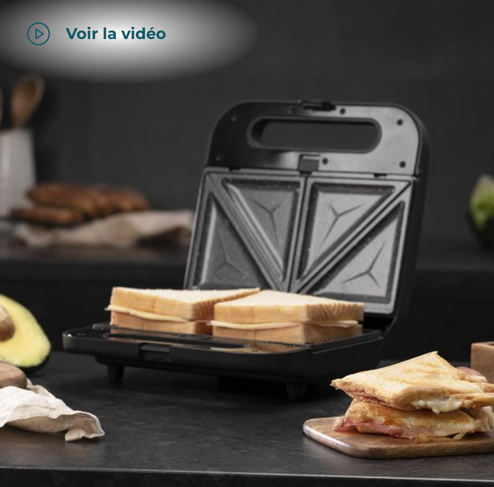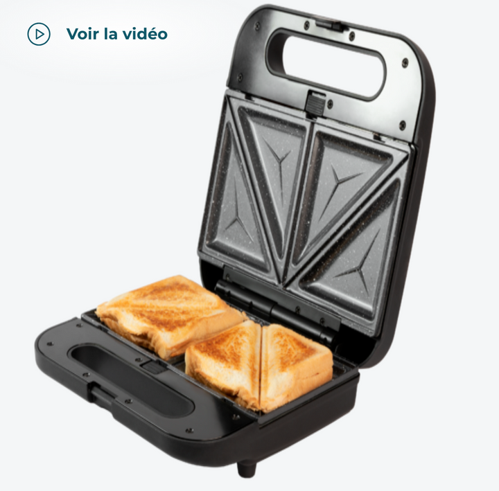 Appareil à sandwichs 3 en 1 avec 3 plaques démontables et interchangeables pour que vous prépariez tous types d’aliments : sandwichs, gaufres et gril.