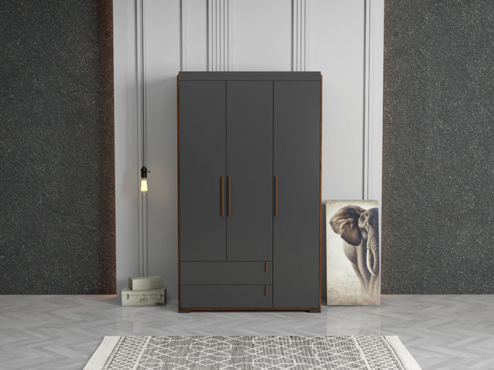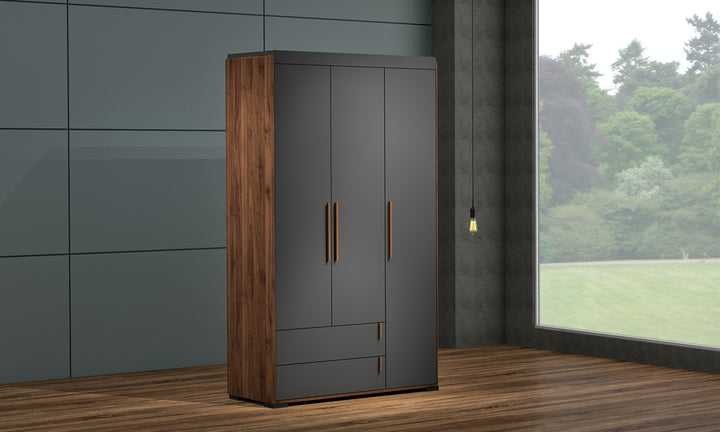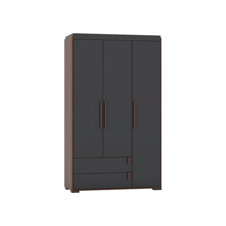 Armoire 3 Portes 2 Tiroirs / BR3 WR308MP-CLB/DG Structure en panneau de particules mélaminé recouvert de papier décor noyer / anthracite. Dimensions : 122x50xH205cm