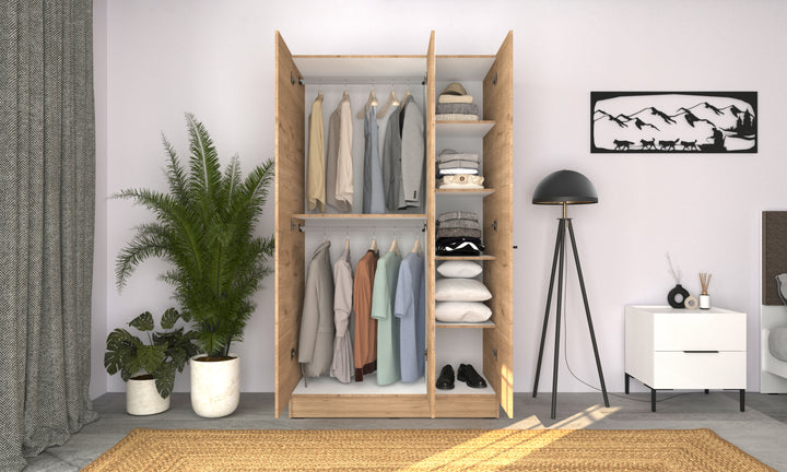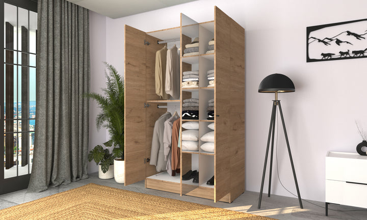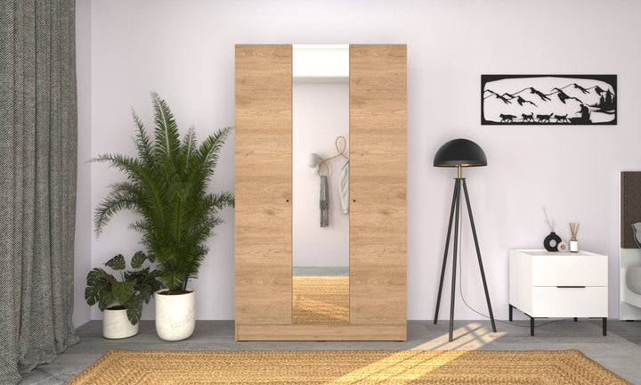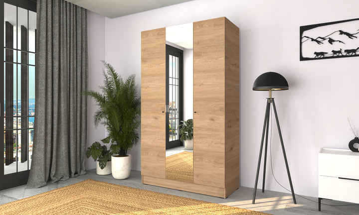 Armoire 3 portes / GRA-730-FF-3 Armoire 3 portes avec 1 miroir – 100% panneau de particules mélaminé – 120x212x52 cm – Poignées avec revêtement en chrome – Côté droit, 1 porte avec 5 sections – Côté gauche, 2 portes avec 1 miroir et 2 sections avec penderie disponible – Design sportif