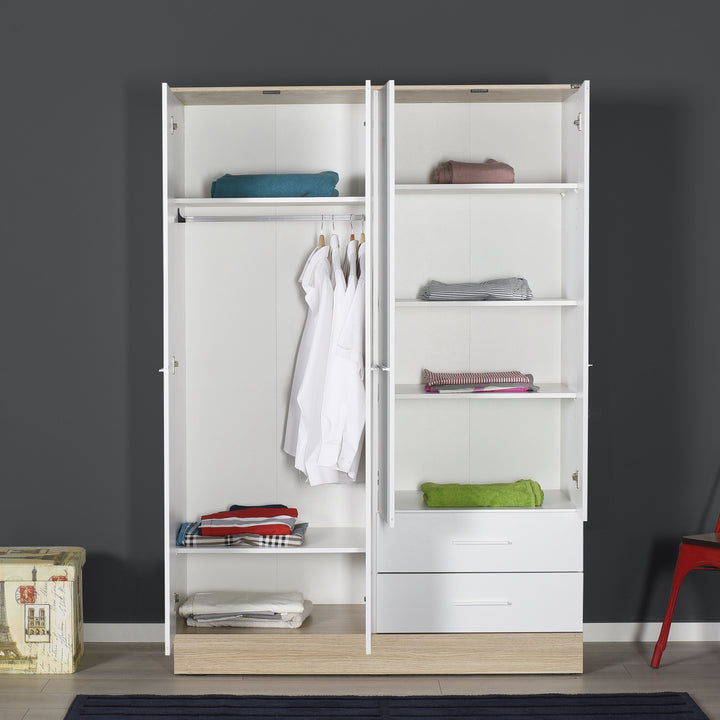 Côté gauche,:2 portes avec 1 étagère en haut et 1 en bas et 1 penderie