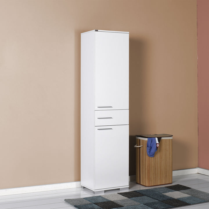 Optimisez votre espace avec cette armoire de rangement en blanc brillant laqué (45 x 187 x 40 cm). Son intérieur offre 4 étagères mobiles et 1 étagère fixe pour une organisation modulable au quotidien. Sa poignée chromée ajoute une note élégante et contemporaine. Polyvalente, elle s’intègre aussi bien dans la salle de bain, la cuisine, le bureau, la cave, près d’une porte ou sur un balcon, etc.