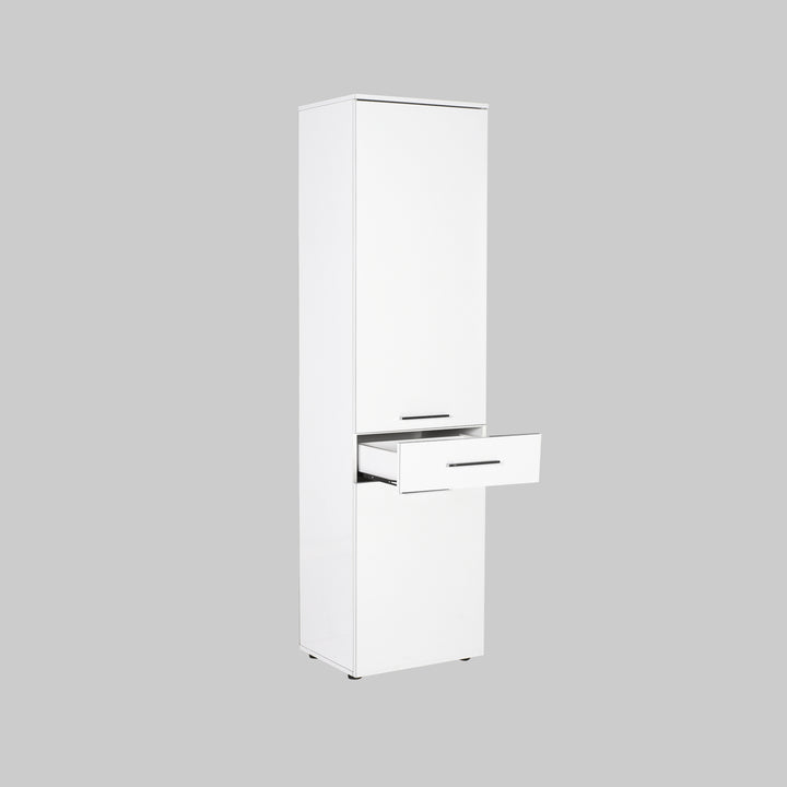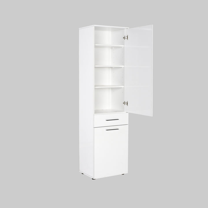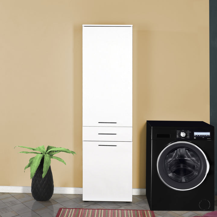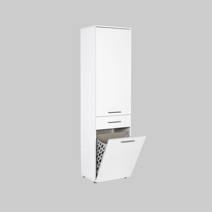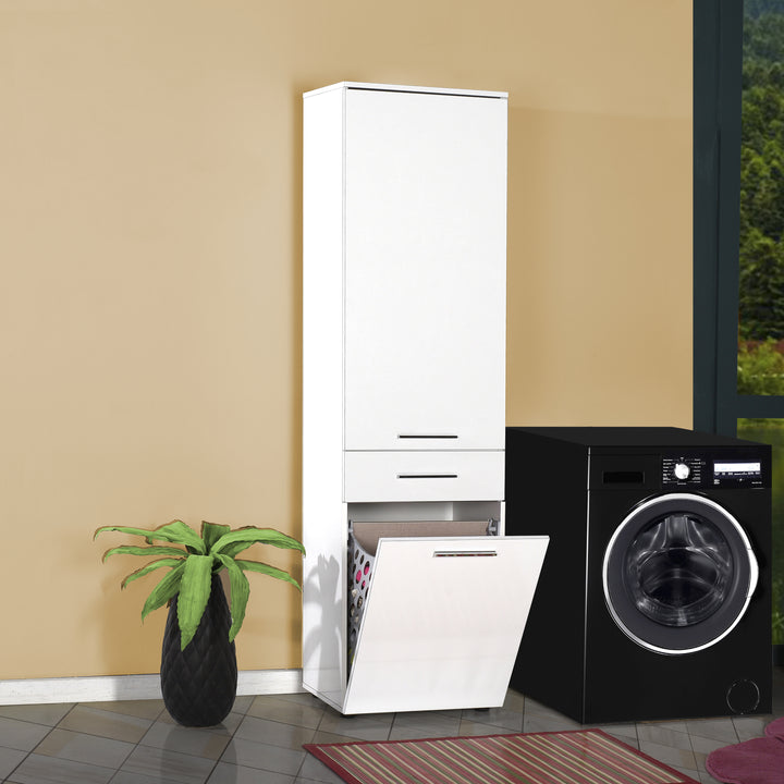Optimisez votre rangement avec cette armoire polyvalente, conçue pour s’adapter à vos besoins au quotidien. Elle dispose d’un compartiment équipé de 4 étagères, dont 3 mobiles pour ajuster la hauteur comme vous le souhaitez, d’un compartiment dédié à un panier rabattable et d’un grand tiroir pour vos essentiels. Ses poignées en métal chromé allient style et robustesse. Idéale pour de multiples usages, elle trouve facilement sa place dans la salle de bains, la cuisine, sur un balcon, près d’une porte ou dans une chambre.