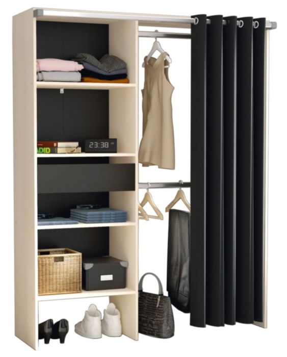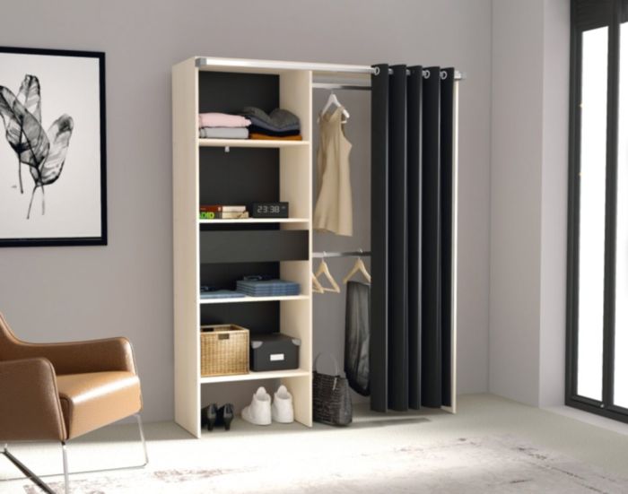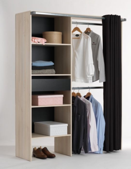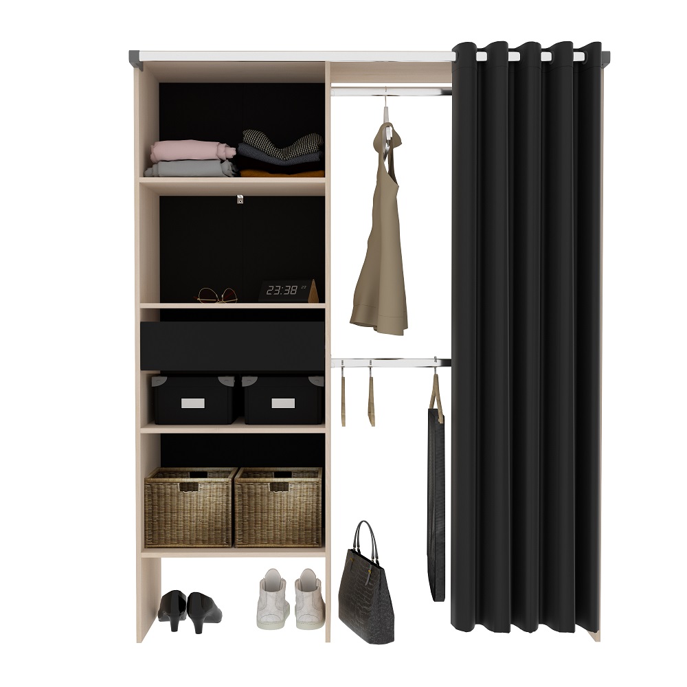 Kit dressing à rideau complet Bali Indus de 180 cm décor acacia avec rideau noir à œillets, composé d’une partie penderie haute et basse et d’une colonne avec tablettes et tiroir. Ce modèle reprend les codes esthétiques du design industriel. L’aménagement de placard est avec un décor acacia de ton beige. Il se compose d’une colonne avec 4 tablettes larges et un tiroir noir de 60 cm sur coulisses à billes; de 2 barres de penderie pour soirées haute et basse. Il est fermé par un rideau noir en polyester de 210 cm avec 12 oeillets. La profondeur totale avec le rideau est de 48 cm et de 40 cm seulement pour le meuble. Le montage est facile et toute la quincaillerie nécessaire est incluse dans le kit.