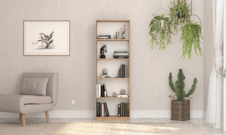 Bibliothèque à 5 étagères pensée pour optimiser le rangement. Ses dimensions de 58 x 170 x 23 cm s’intègrent facilement dans votre intérieur. Conçue en 100 % panneau de particules mélaminé, elle propose un design ergonomique pour une utilisation confortable. Très facile à monter, elle est parfaite pour les chambres d’enfants et d’adolescents.