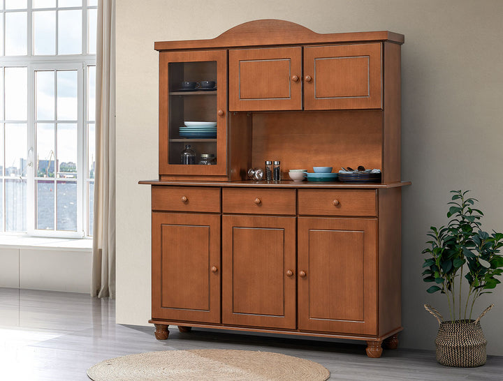 Ce buffet de cuisine allie solidité et élégance grâce à une structure en panneau de particules et en HÉVÉA MASSIF, mise en valeur par un coloris merisier chaleureux.