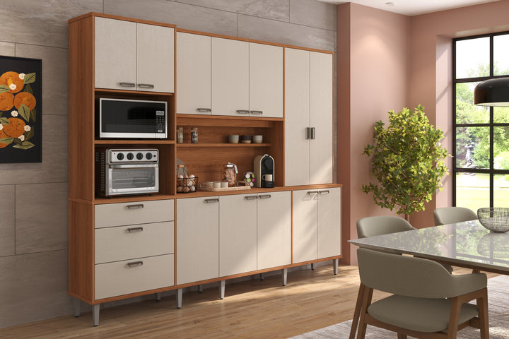 Buffet de cuisine PULSE/ 904202 Dimensions assemblées : 220 cm x 255 cm x 41 cm – Hauteur x Largeur x ProfondeurPoids supporté 80 kg répartis ; Produit MDP/MDF; Peinture sur bois; Tiroirs avec glissières télescopiques; Tiroir avec organiseur de couverts en MDP; Plateau intermédiaire en MDP 25 mm ;