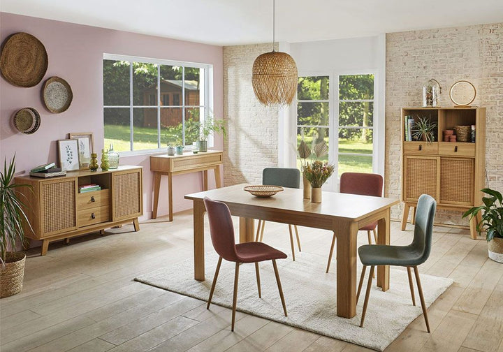 Le Buffet MALANG allie style et fonctionnalité grâce à une structure en panneau de particules et MDF, habillée d’un papier coloris chêne avec imitation tressage. Son piètement en bois et ses poignées en imitation cuir apportent une touche chaleureuse et élégante. Ce meuble bas comprend 3 portes et 2 tiroirs pour organiser facilement vos affaires, et mesure 194 x 40 x 80 cm.