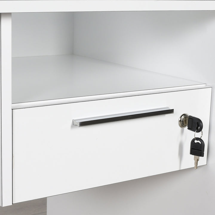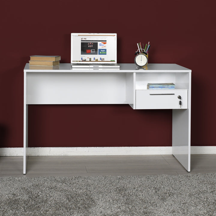 Alliant élégance et praticité, ce bureau CMS-510-DD-1 présente des dimensions de 120 x 75 x 60 cm et une finition blanc laqué qui s’intègre facilement à tout intérieur. Idéal à la fois pour la maison et pour le bureau, il offre un large plan de travail utile de 120 x 60 cm pour installer ordinateur, documents et accessoires. Pour sécuriser vos effets, il dispose d’un tiroir verrouillé, équipé d’une poignée de tiroir en métal chromé, à la fois robuste et agréable à utiliser.