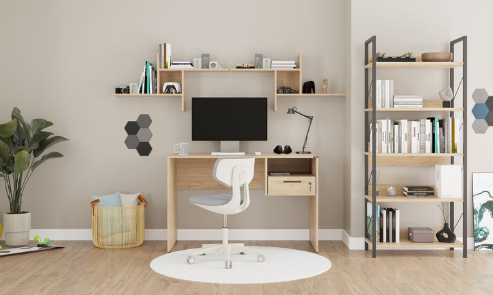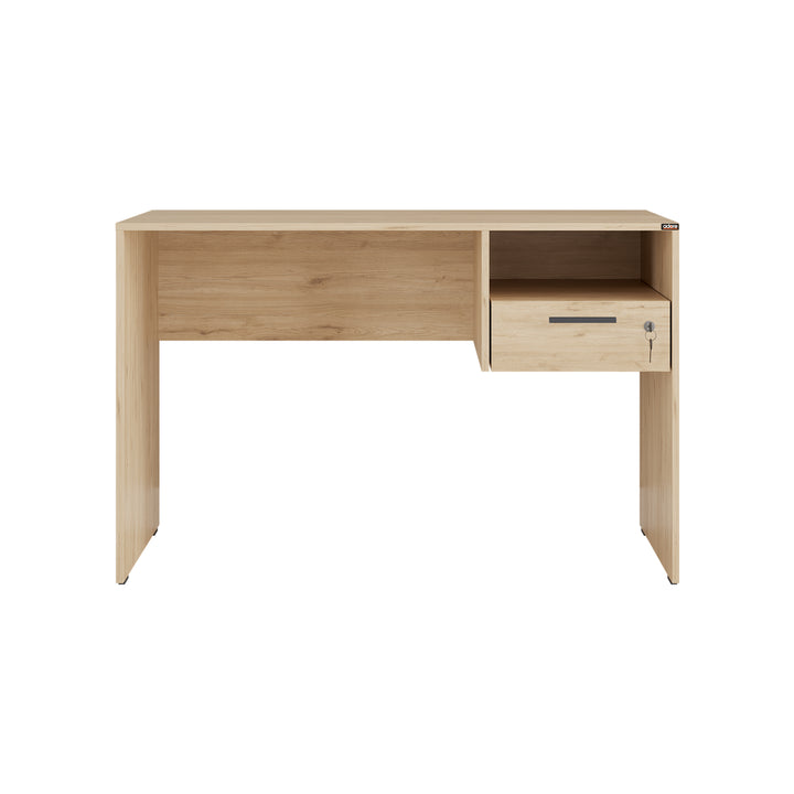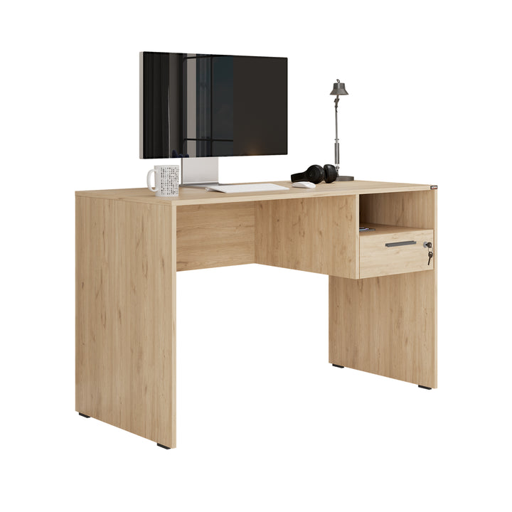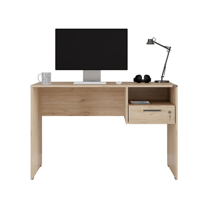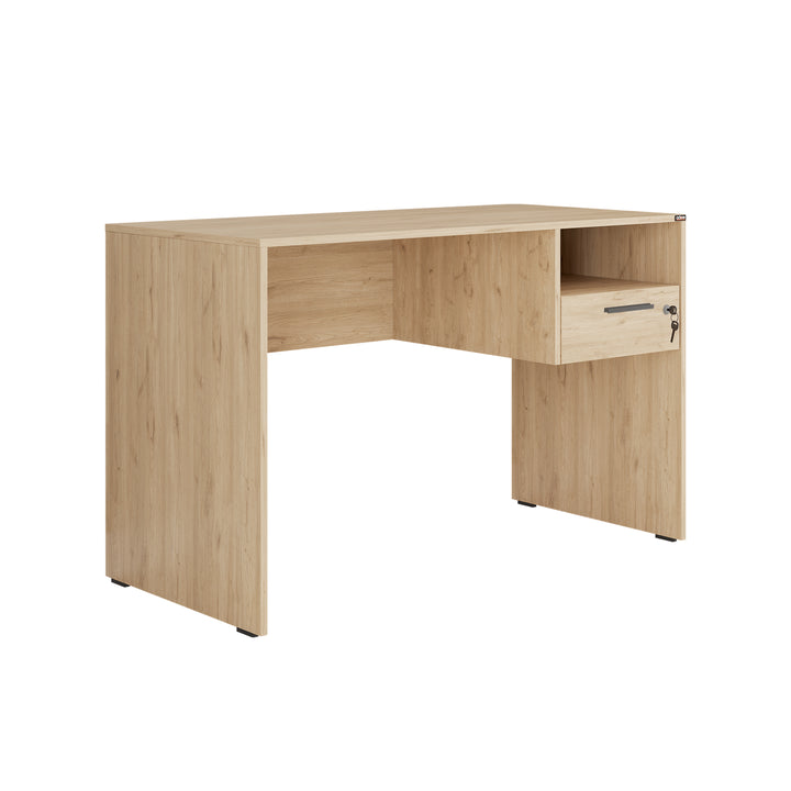 Ce bureau avec clé (CMS-510-FF-1) affiche une élégante finition blanc laqué et des dimensions de 120 x 75 x 60 cm. Son grand plateau de 120 x 60 cm offre un espace de travail généreux, idéal aussi bien pour la maison que pour le bureau. Il est doté d’un tiroir verrouillable à clé pour sécuriser vos effets, avec une poignée en métal chromé pour une utilisation confortable et durable.