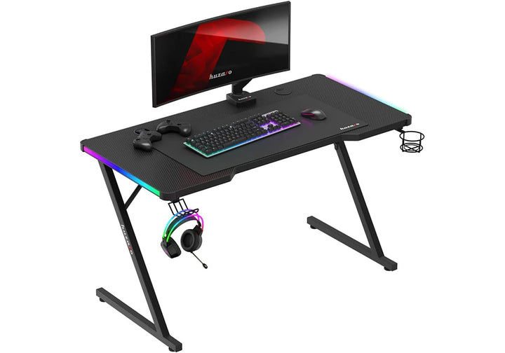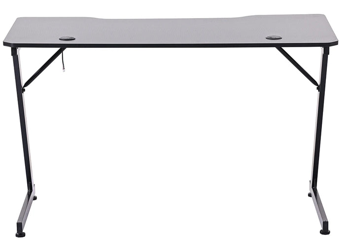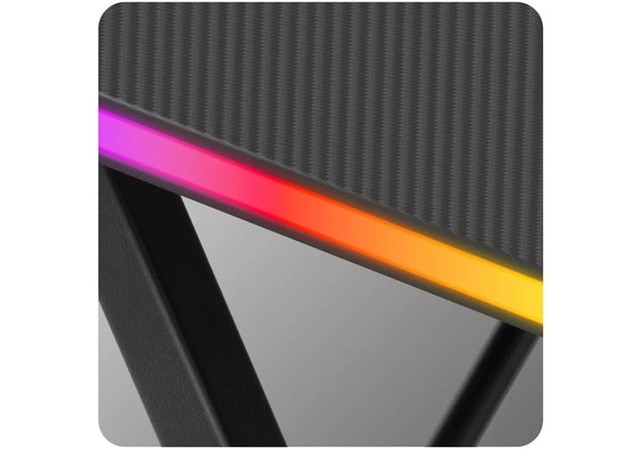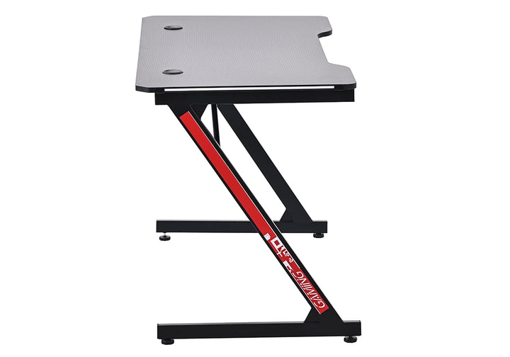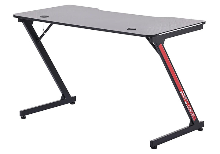 Pensé pour le jeu, ce bureau allie une structure robuste en acier coloris noir à un plateau en panneau de particules. Sa surface antidérapante à finition fibre de carbone assure une parfaite stabilité, tandis que le revêtement mélaminé intègre un éclairage LED pour créer une ambiance immersive. L’ensemble affiche un style affirmé en rouge et noir.