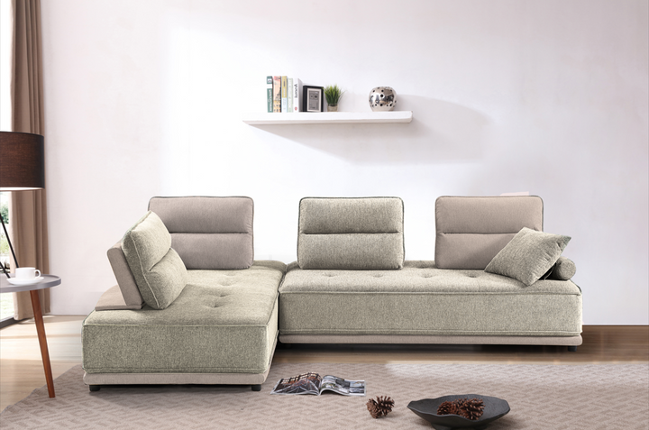 Canapé d’angle bicolore / SF-319 BROWN Structure en panneau de particules, assise mousse en polyuréthane recouverte de tissu bi-ton côtelé 298x197xH88cm. LES + PRODUITS Modulable en lit Design exceptionnel Têtières modulables Salon réversible droit ou gauche Transformable en mode couchage