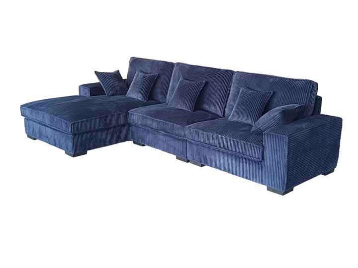 Canapé d’angle Bleu / H-9700BLUELEFT Structure en panneau de particules, assise mousse en polyuréthane recouvert de tissu microfibre côtelé épais coloris bleu. Dimensions : 332x178xH90cm