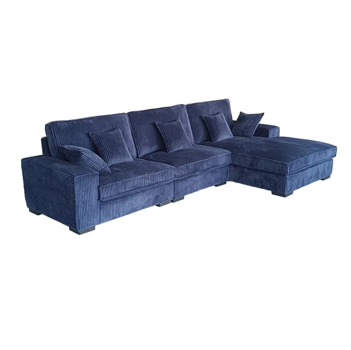 Conçu pour allier style et confort, ce canapé d’angle dispose d’une structure en panneau de particules et d’une assise en mousse de polyuréthane, le tout habillé d’un tissu microfibre côtelé épais, coloris bleu. Ses dimensions généreuses de 332 x 178 x H 90 cm offrent un espace convivial pour accueillir famille et invités.