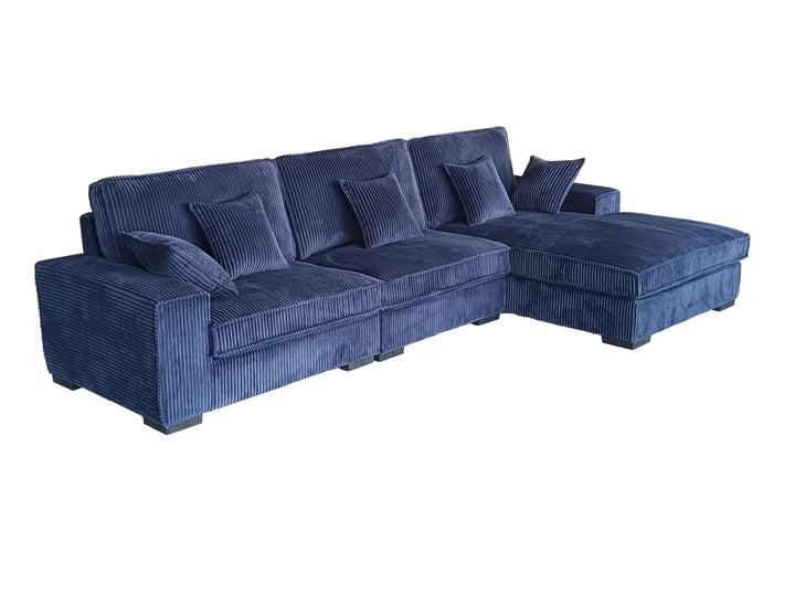 Canapé d’angle Bleu / H-9700BLUERIGHT Structure en panneau de particules, assise mousse en polyuréthane recouvert de tissu microfibre côtelé épais coloris bleu. Dimensions : 332x178xH90cm