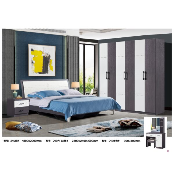 La chambre à coucher 216 incarne le style moderne avec une touche de sophistication. Conçue pour allier confort et esthétique, elle comprend un lit spacieux (180×200 cm), parfait pour des nuits reposantes, accompagné de deux chevets en finition laquée, apportant une élégance discrète. L’ensemble est complété par une armoire à 6 portes, offrant une capacité de rangement optimale pour organiser vêtements et accessoires, ainsi qu’une coiffeuse fonctionnelle et raffinée, idéale pour vos moments de préparation. Avec ses lignes contemporaines et ses finitions soignées, la chambre à coucher 216 crée une ambiance chaleureuse et tendance, transformant votre espace nuit en un véritable lieu de bien-être.