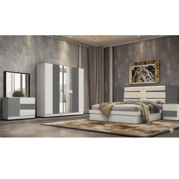 Ensemble chambre UL-LR00078 : lit 160 cm, 2 chevets, coiffeuse et armoire. Design moderne, grande capacité de rangement pour une chambre élégante et fonctionnelle.