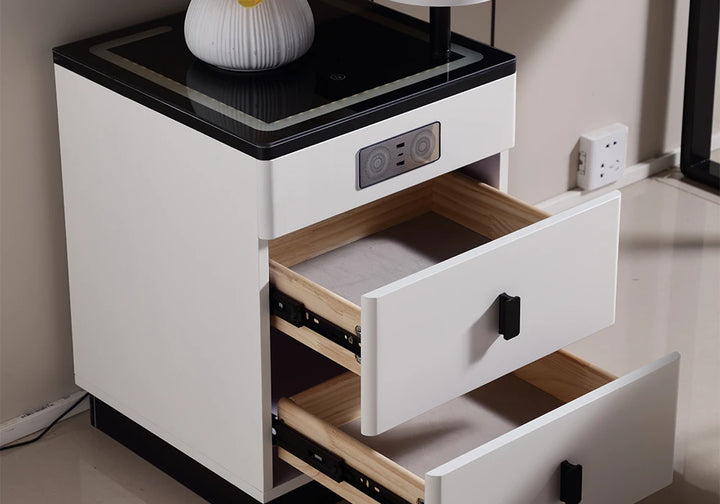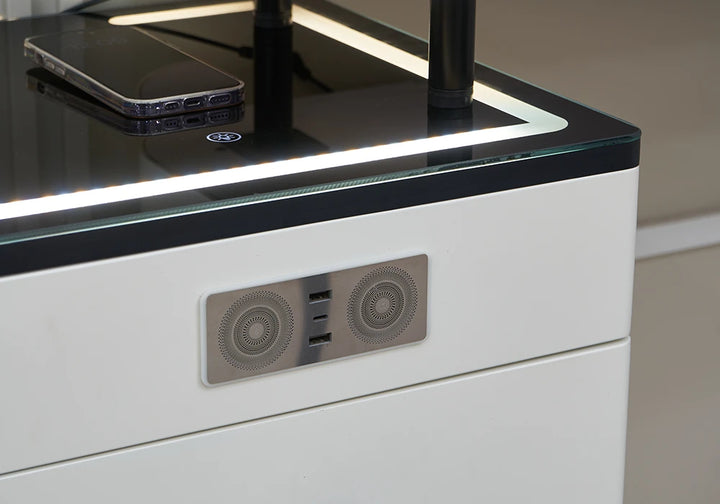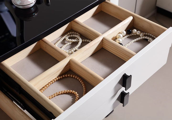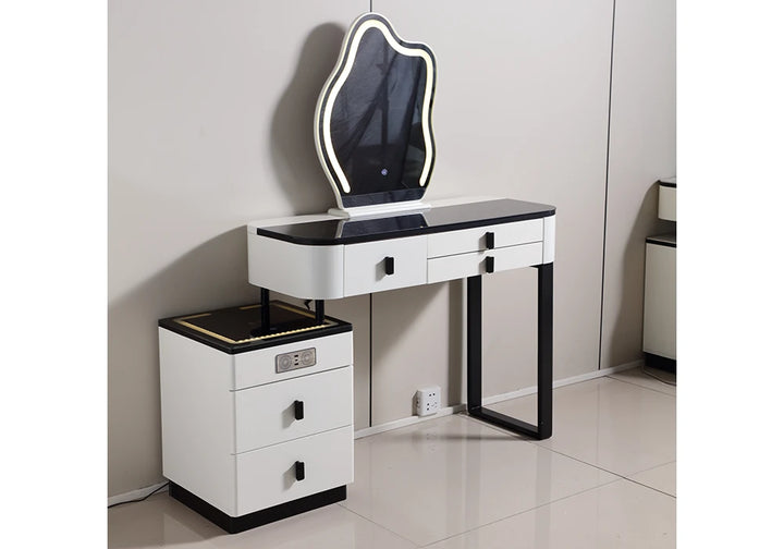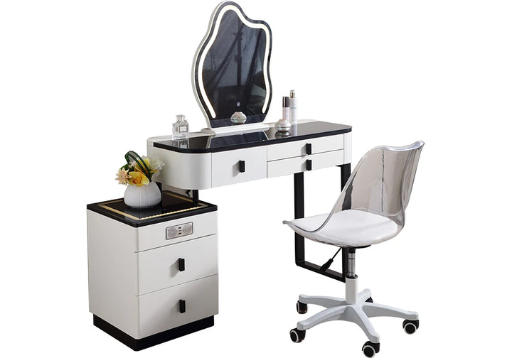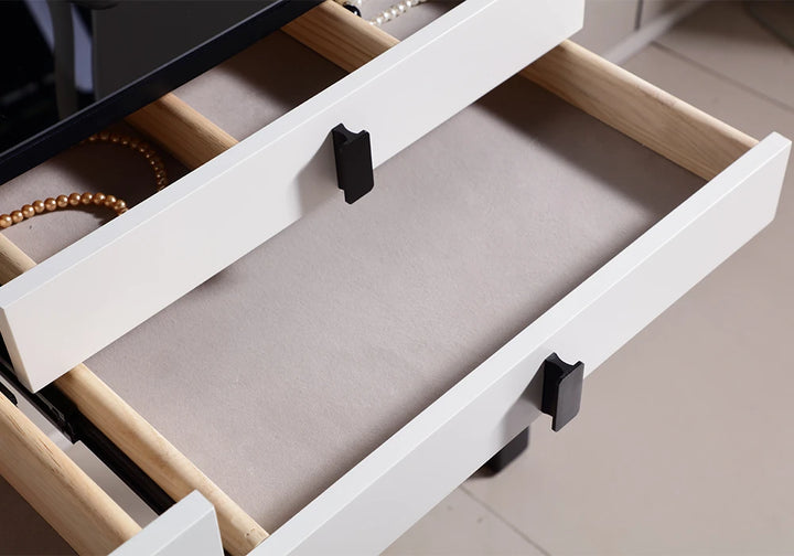Alliant élégance et praticité, cette coiffeuse est conçue avec une structure en panneaux de particules et en pin massif, recouverts d’un papier blanc brillant, et complétée par une vitre noire. Ses dimensions de 130 x 40 x H140 cm offrent un format généreux sans encombrer l’espace. Pour une organisation optimale, elle intègre 5 tiroirs. Son miroir LED à 3 couleurs, doté d’une commande tactile, permet d’ajuster l’éclairage selon vos besoins. Côté confort d’utilisation, elle embarque un haut-parleur Bluetooth/USB pour profiter de votre musique et un chargeur sans fil pratique pour recharger vos appareils.