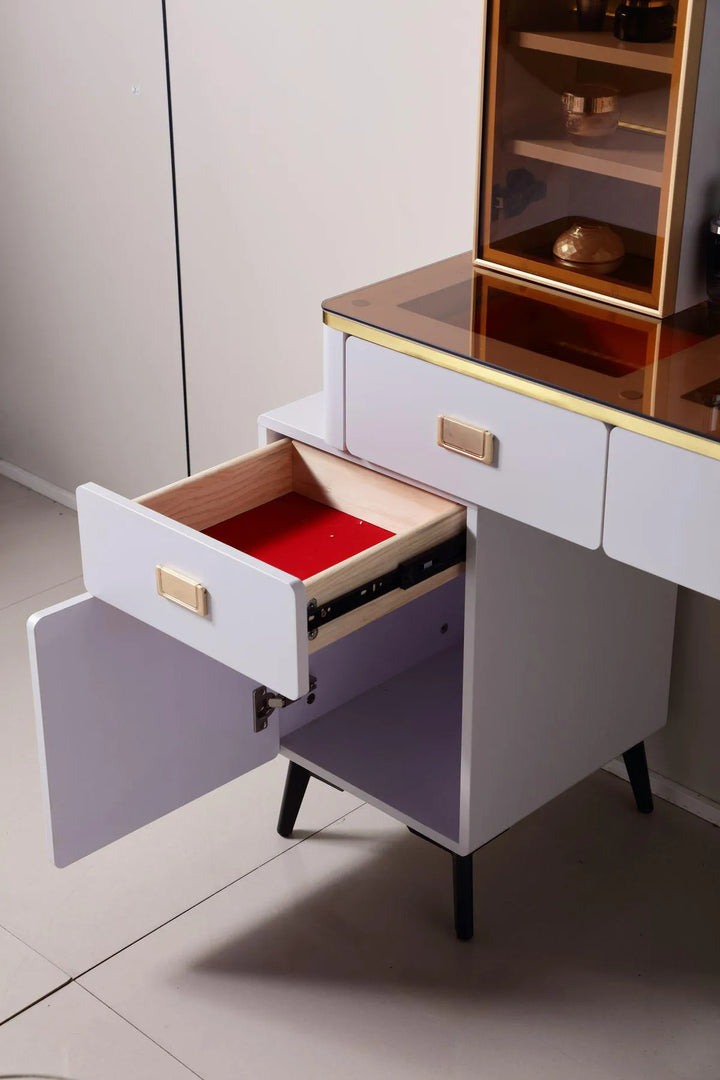 Compartiment de rangement visible et pratique avec surface en verre trempé couleur thé