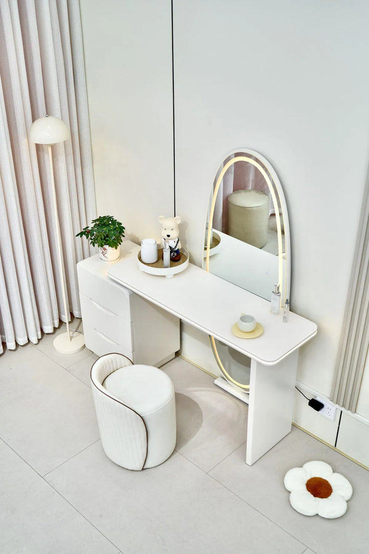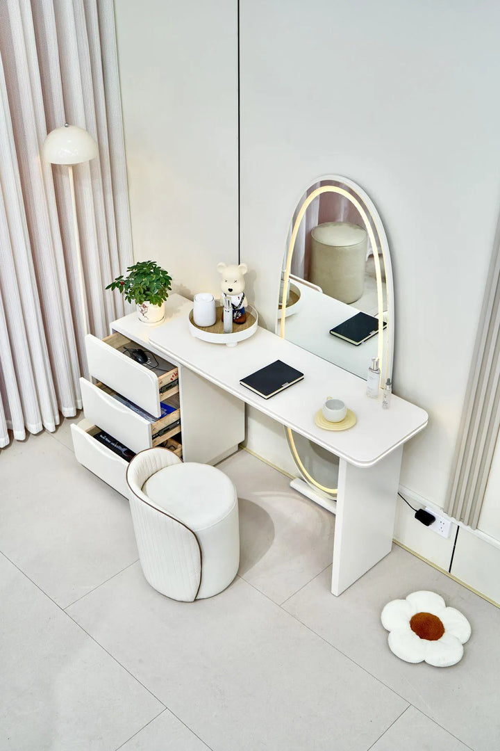 Magnifique coiffeuse , vendu avec pouf Miroir de maquillage à écran tactile LED : surface miroir haute définition, image claire sans déformation. Livré avec une lumière qui est naturelle et ne blesse pas les yeux, touche intelligente