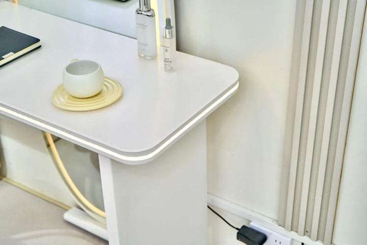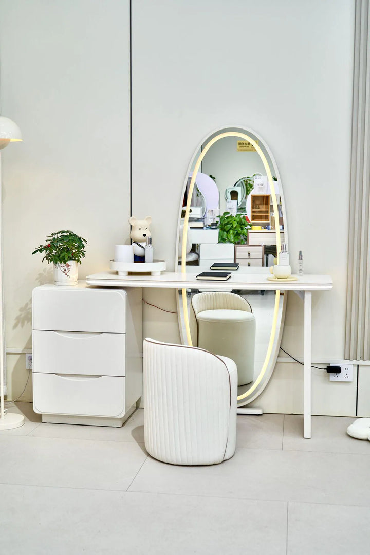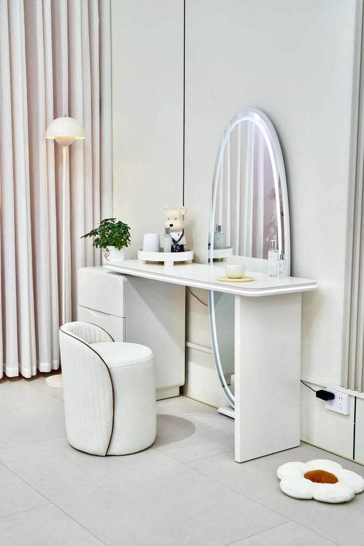 Magnifique coiffeuse vendue avec son pouf assorti. Elle est équipée d’un miroir de maquillage à écran tactile LED avec surface haute définition, offrant une image nette et sans déformation. La lumière intégrée, naturelle et douce pour les yeux, se règle facilement grâce à une touche intelligente.