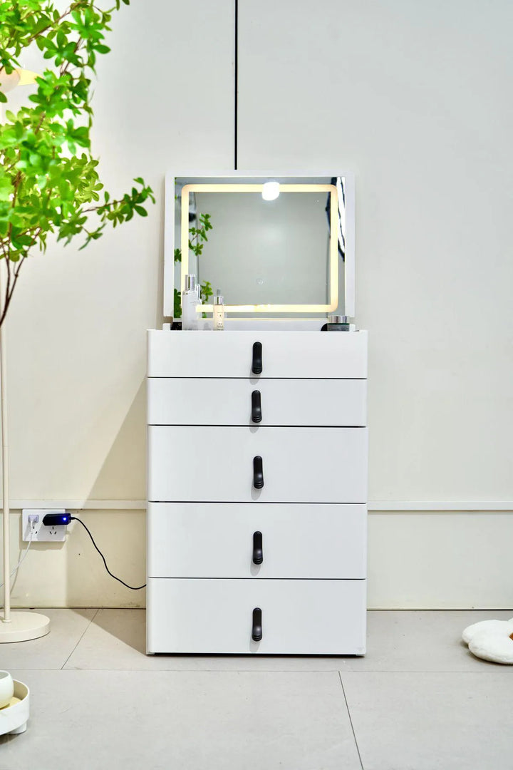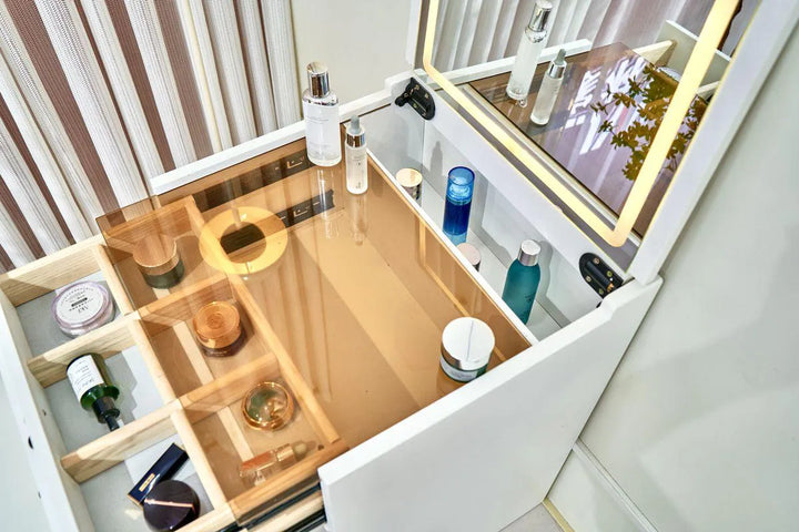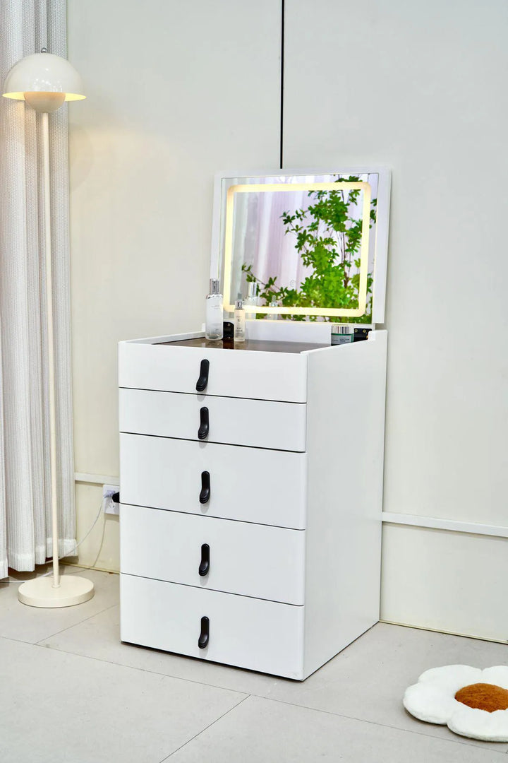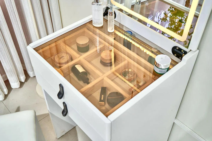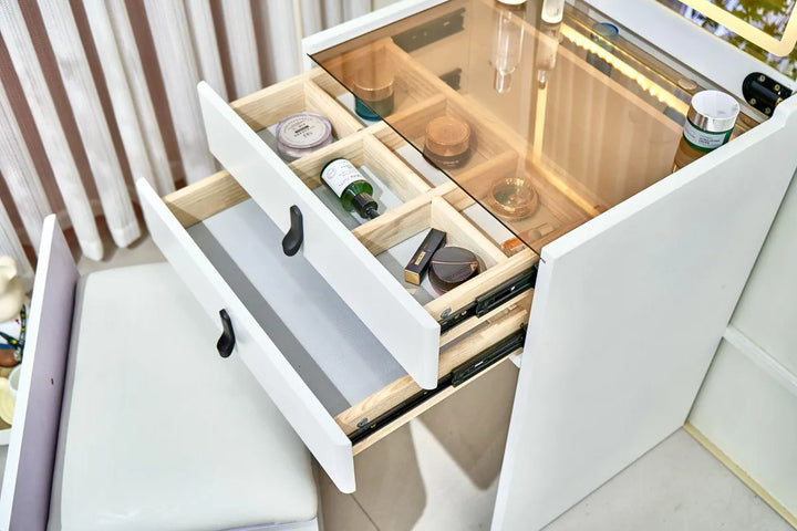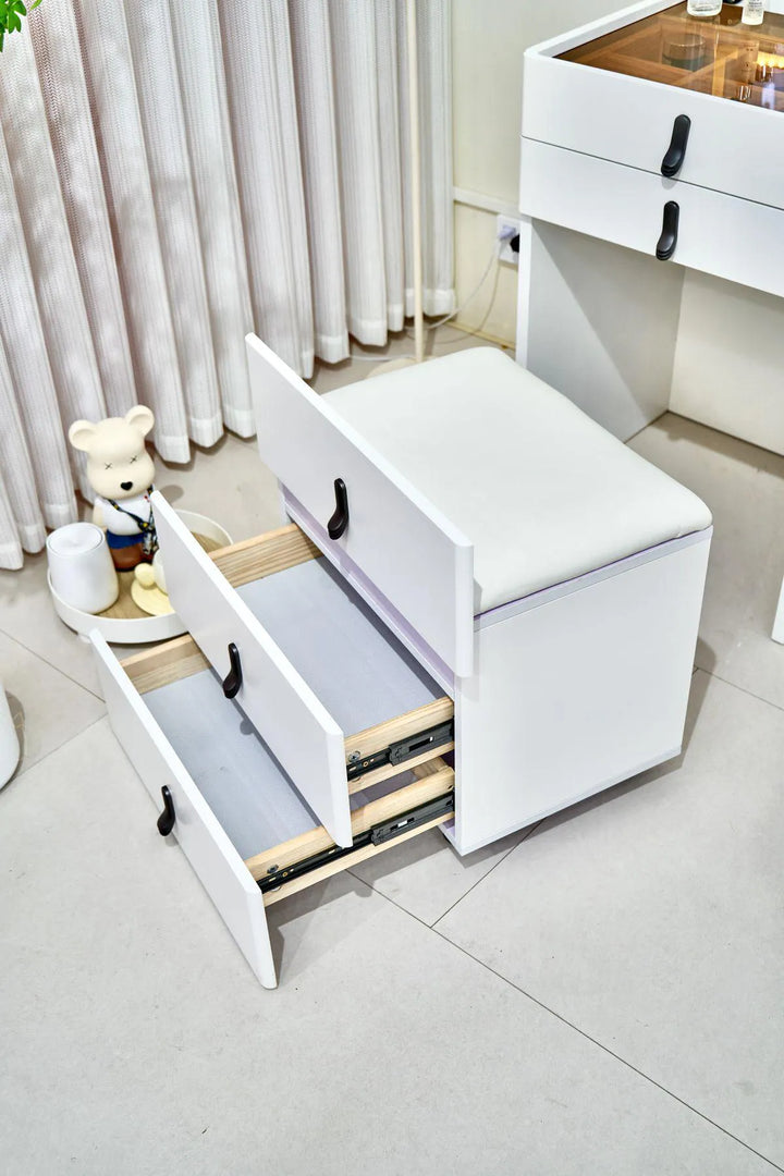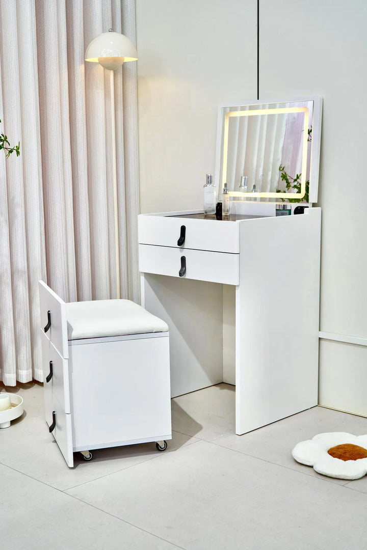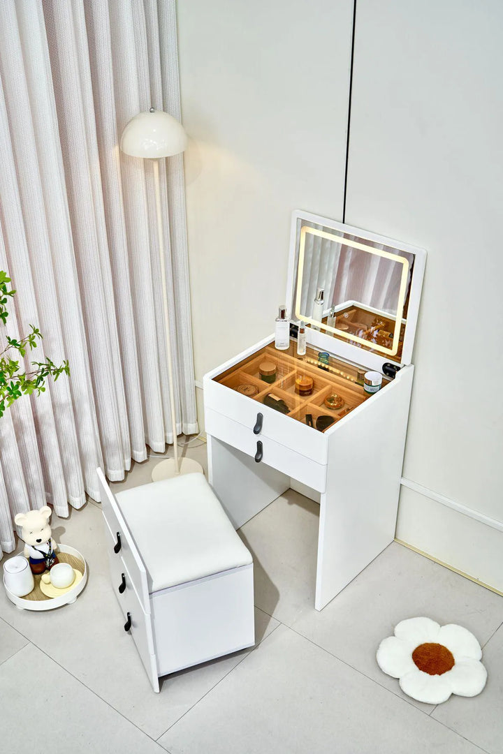 Élégante coiffeuse, vendue avec un pouf. Son miroir de maquillage à écran tactile LED offre une surface de miroir haute définition pour une image claire et sans déformation. Elle est livrée avec une lumière naturelle qui ne blesse pas les yeux, et une touche intelligente permet un réglage simple et rapide.