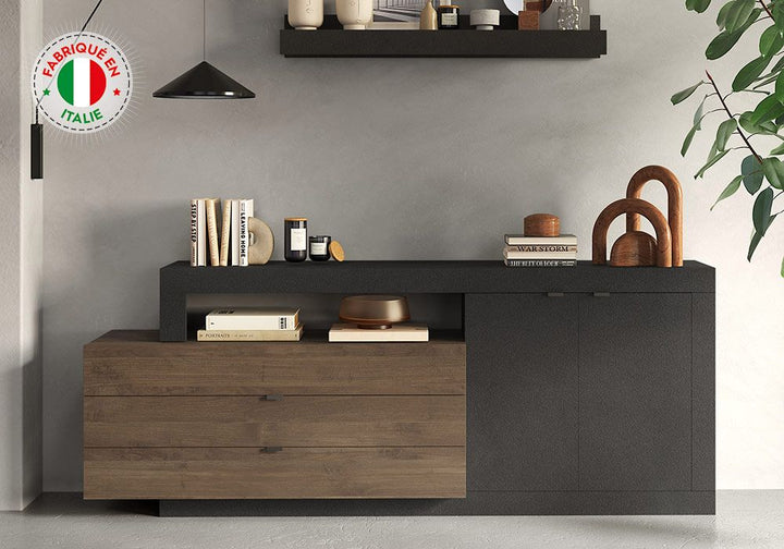 ENFILADE 2 PORTES 3 TIROIRS ET MIROIR (COLLECTION JANA LAVA/MERCURE) / 17383-17748 Structure en panneau de particules mélaminé coloris lava / mercure. Dimensions : 200x42xH80cm LES + PRODUITS : Design moderne Qualité de fabrication en italienne Le buffet de la collection Jana Lava/Mercure est un meuble de salle à manger contemporain et élégant. Avec une longueur de 200cm, il est assez spacieux pour contenir une grande quantité de vaisselle, de verres ou d’autres objets divers. Son plateau supérieur offre un bel espace pour mettre en valeur quelques-uns de vos objets de décoration tandis que l’intérieur de ce buffet, bien aménagé, peut servir de rangement pour des affaires que vous souhaitez conserver hors de vue.