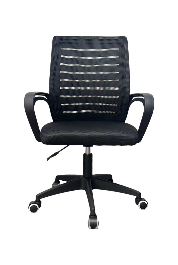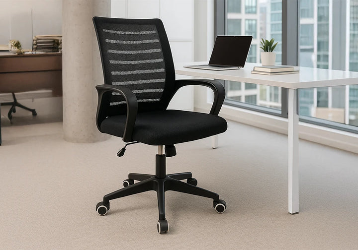 Assise et dossier noir en maille respirante, hauteur réglable et mécanisme papillon, cadre en polypropylène, coussin d’assise de 8 cm. Base solide en polypropylène 300 avec roulettes et son vérin à gaz de classe 2.