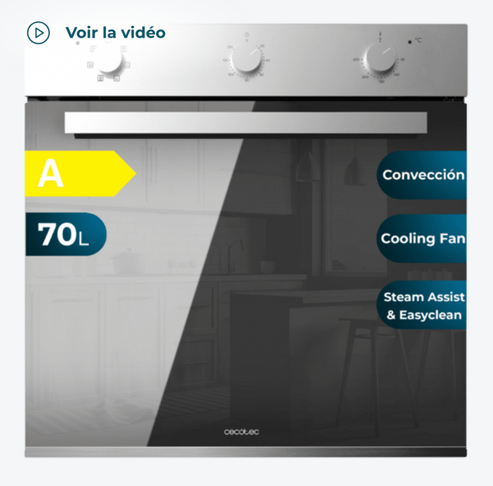 Four encastrable multifonction 70 L / 4728 GRANDE CAPACITÉ : Cuisine pour toute la famille avec sa grande capacité de 70 litres et ses 5 positions de plateaux. 6 fonctions : choisissez entre ses fonctions Dégivrage, Conventionnel, Chaleur de sole, Convection, Convection + Gril et Mode Eco et utilisez celle qui correspond le mieux à vos besoins. Cooling Fan : système de ventilation d’air pour un refroidissement optimal du four pendant et après la cuisson. Minuteur : programmez votre cuisson selon le temps dont vous avez besoin, en évitant de brûler et en obtenant la cuisson souhaitée. Steam Base XXL : Zone Steam XXL jusqu’à 0,8 L pour l’utilisation des fonctions Steam EasyClean et Steam Assist. Steam Assist : Préparez vos plats avec cette fonction, en combinant la cuisson avec la vapeur pour que vos recettes soient croustillantes à l’extérieur et juteuses à l’intérieur. Steam EasyClean : la vapeur élimine les saletés et permet un meilleur nettoyage, sans aucune difficulté. Porte triple verre : porte froide avec 3 verres qui nous évite de nous brûler en touchant le verre extérieur et évite les pertes de chaleur. Classe énergétique A : économisez à chaque utilisation et réduisez la consommation d’énergie sans réduire l’efficacité lors de la cuisson de vos recettes. Puissance 2800 W : préparez tous types de recettes grâce à son énorme puissance.