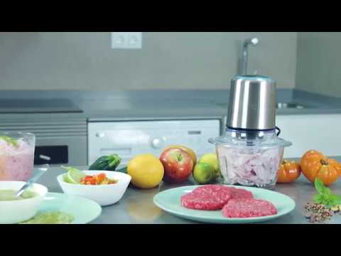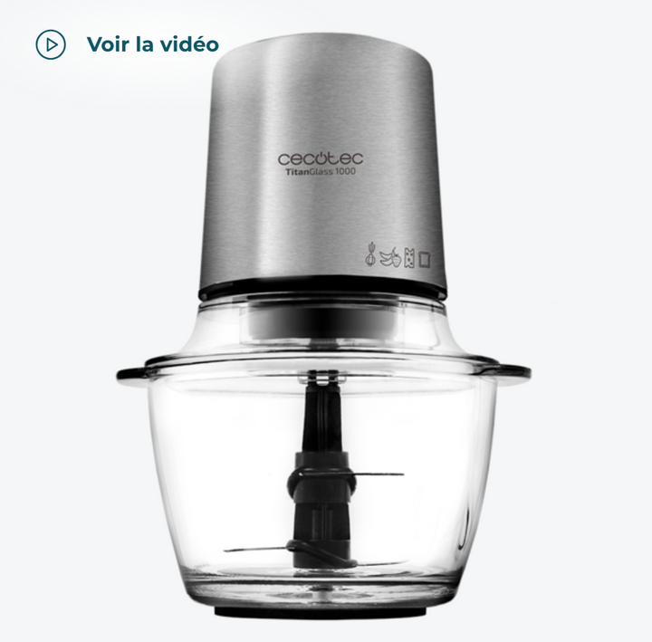 hachoir électrique TitanGlass 1000. Multifonction (pile, broie, pulvérise, coupe) / 3043 Hachoir électrique pour viande et légumes. Il pile la glace. Lames démontables avec revêtement titane. Système ControlSpeed. Bol en verre avec 1 l de capacité. Il convient pour un nettoyage au lave-vaisselle. Cecotec TitanGlass 1000. Bol-hachoir électrique compact pour tous types d’aliments. Unité principale en acier inoxydable. Bol en verre de haute qualité. 1 L de capacité. Lames avec revêtement en titane qui améliore la dureté et maintient l’affûtage plus longtemps. Lames démontables. Possibilité de les utiliser avec 2 ou 4 feuilles ajustables en hauteur. Il rend vos aliments pilés et pulvérise la glace en quelques secondes. 400 W de puissance. Système ControlSpeed : régule la vitesse selon la pression avec laquelle vous appuyez sur le bouton. Pièces non électriques qui conviennent pour un nettoyage au lave-vaisselle. Facile à démonter et à nettoyer. Base antidérapante et espace range-câbles.