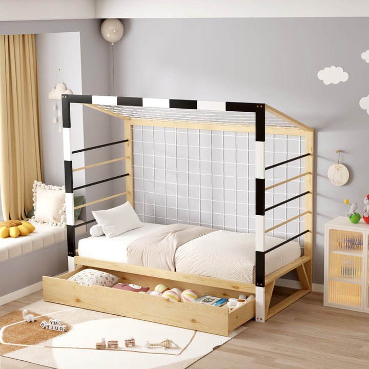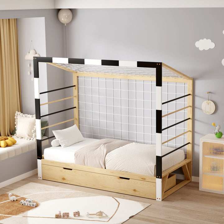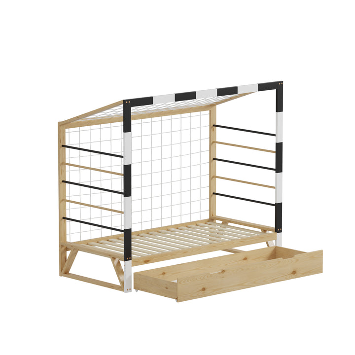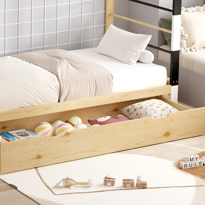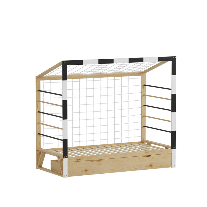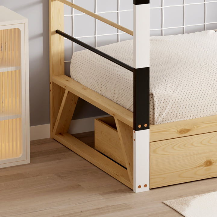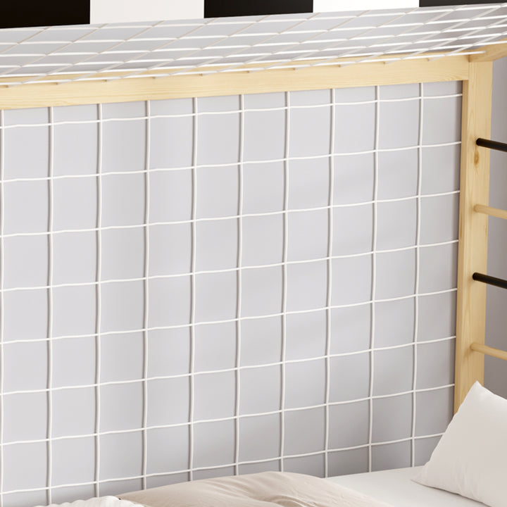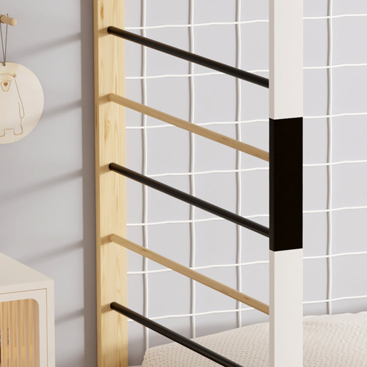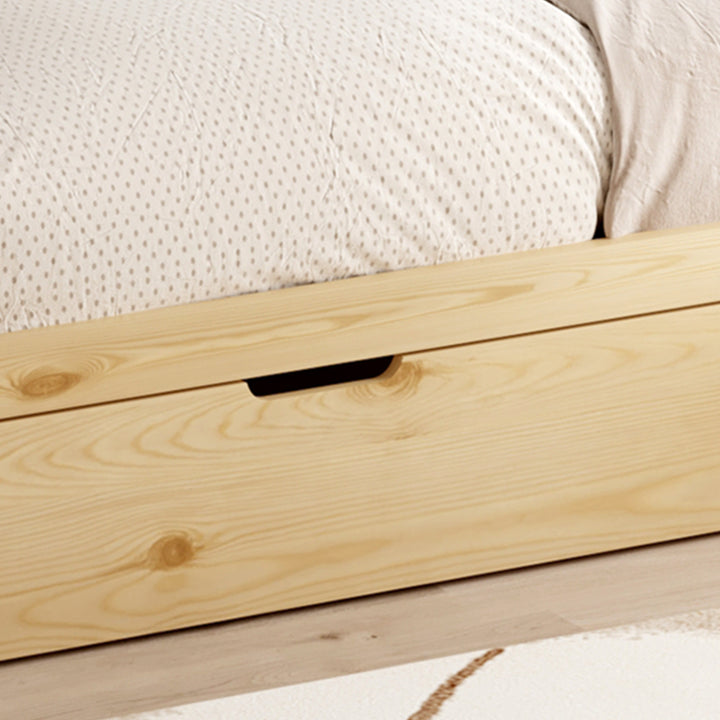 Ce lit allie robustesse et charme grâce à sa structure en pin massif, proposée dans un coloris naturel et blanc qui s’intègre facilement à votre décoration. Il est vendu avec sommier, sans matelas. Dimensions : 93,5 x 202 x H145 cm.