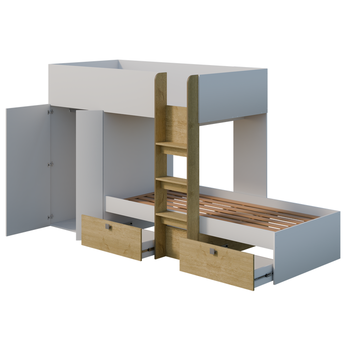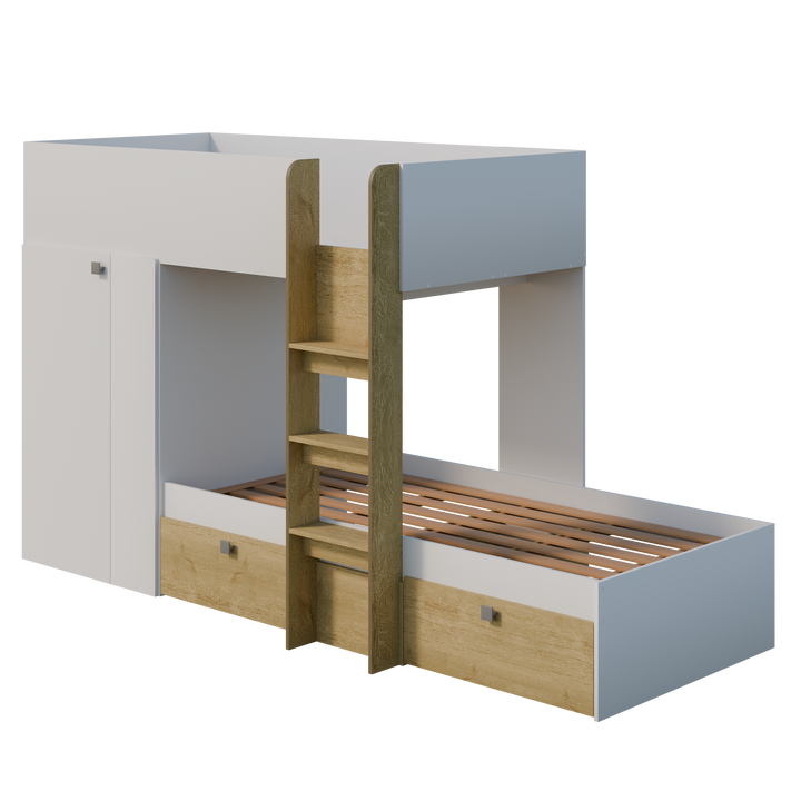 LES + PRODUIT : Lit superposé compact, gain de place 2 couchages superposés, idéal chambre enfant Finition blanc et bois, rendu doux et actuel Échelle centrale intégrée, accès facile Rangements intégrés : Armoire avec portes et 2 tiroirs sous le lit inférieur Espaces pratiques pour vêtements et jouets Barrières de sécurité pour le couchage supérieur