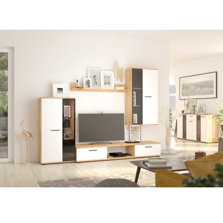 Le Living SALSA.WHAR01 réunit tout le nécessaire pour un salon élégant et fonctionnel. Il comprend une étagère suspendue (160 x 1020 x 180 mm), une vitrine (1150 x 590 x 310 mm), une vitrine suspendue (1130 x 590 x 310 mm) et un meuble TV (280 x 1760 x 400 mm). Chaque élément affiche des dimensions étudiées pour optimiser votre espace, offrir des rangements pratiques et mettre en valeur vos objets avec style.