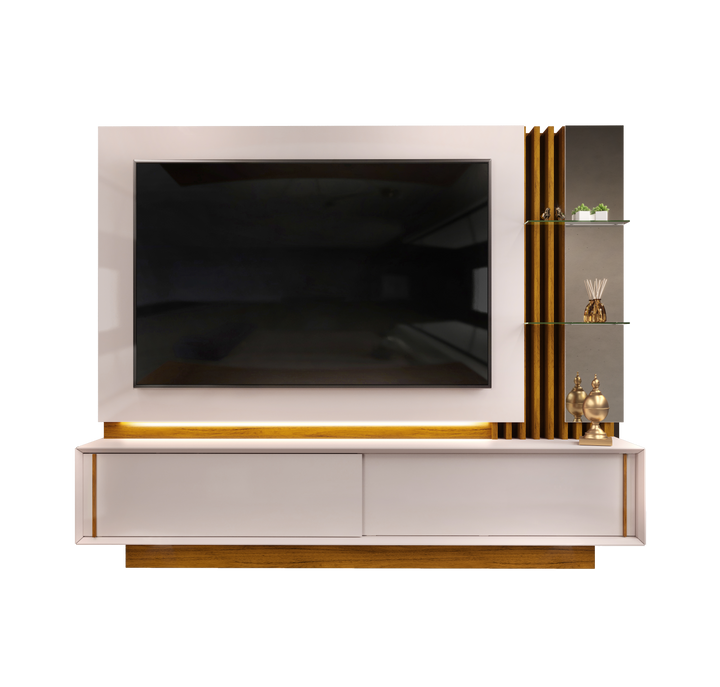 Mettez en valeur votre espace home cinéma avec ce meuble TV et son panneau mural aux détails en lattes, rehaussés par un éclairage à bande LED intégré. Le dessus, la base et les côtés, biseautés de 25 mm, sont finis avec une peinture PU pour une durabilité et une esthétique soignée. Compatible avec les téléviseurs jusqu’à 75 pouces, il offre une présence élégante et robuste.