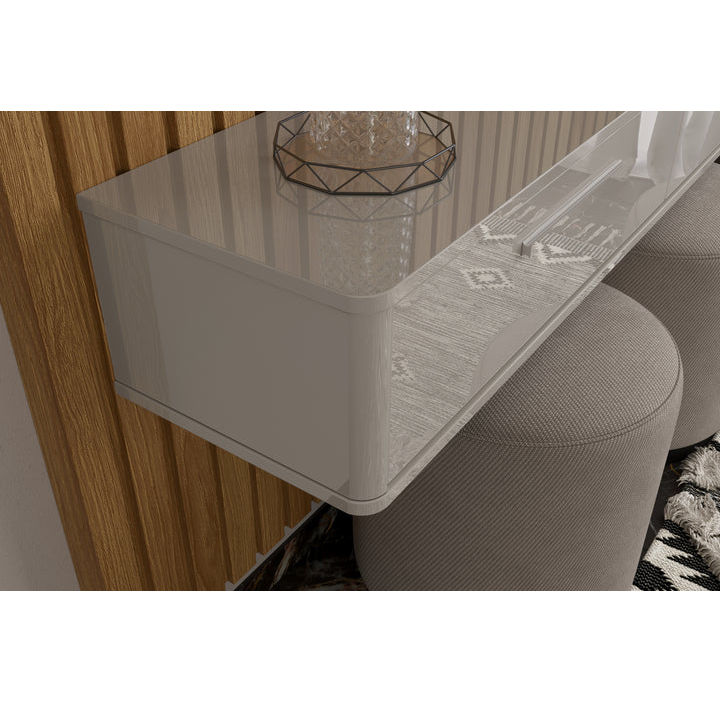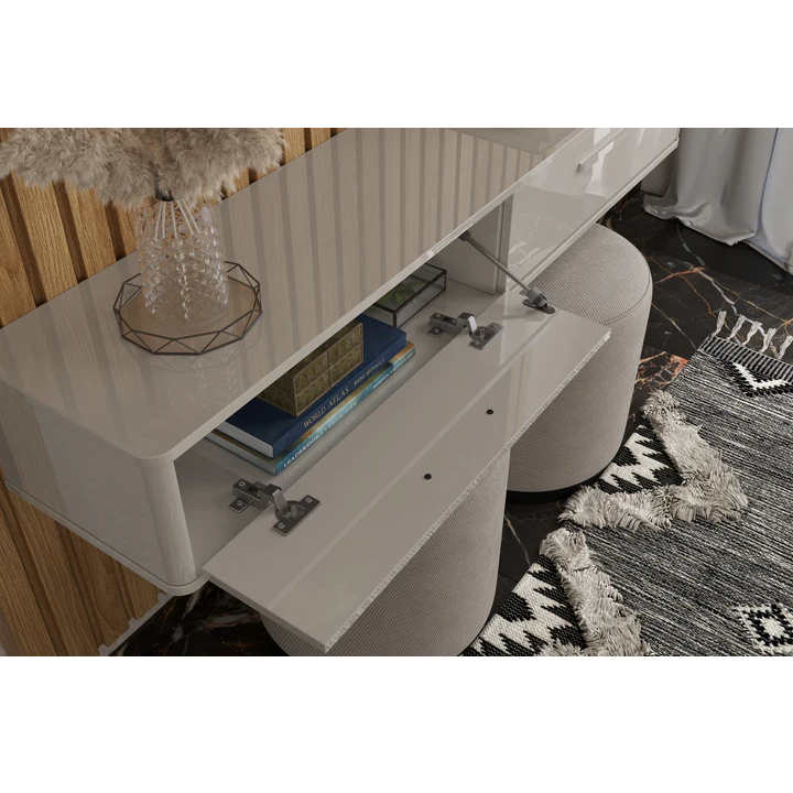 Alliance de style et de solidité, ce meuble TV présente une base et un plateau en MDF de 15 mm, complétés par des côtés en MDF de 25 mm pour une structure fiable. Ses coins arrondis adoucissent les lignes et renforcent le confort au quotidien. Les portes basculantes s’ouvrent en douceur grâce à des pistons à gaz, tandis que les poignées en MDF revêtues assurent une prise agréable et durable. Dimensions : H 210 mm x L 1785 mm x P 296 mm.