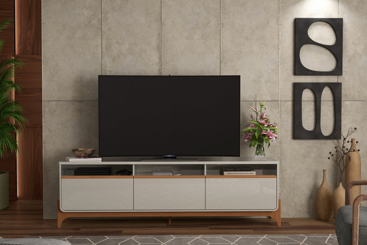 Affirmez un style contemporain avec ce meuble TV, équipé de pieds en bois et d’un élégant détail courbé en MDF usiné. Ses portes latérales en MDF aux finitions arrondies ajoutent une touche raffinée, tandis que les portes basculantes à piston à gaz facilitent l’accès à vos appareils. Son plateau en MDP de 25 mm d’épaisseur garantit stabilité et robustesse. Dimensions : H 555 mm x L 2130 mm x P 385 mm.