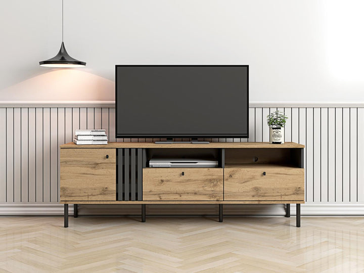 Meuble TV / LV61 TV6112-WTO/DG Structure en panneau de particules, recouvert de papier décor walton oak. Dimensions : 150x39xH51cm