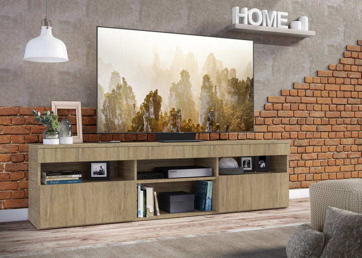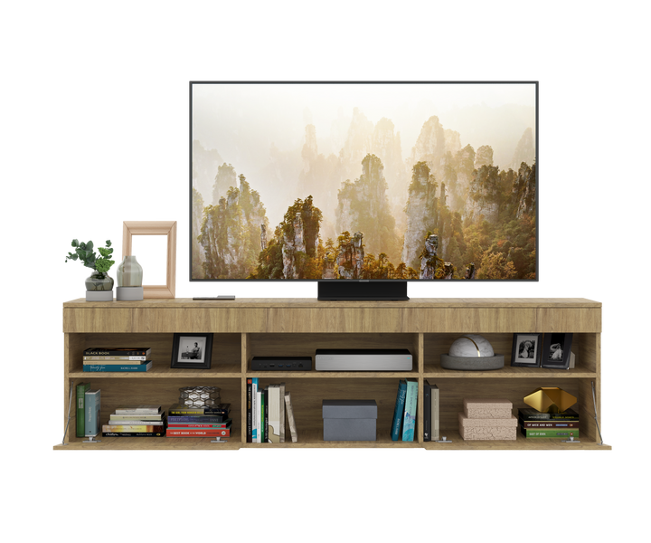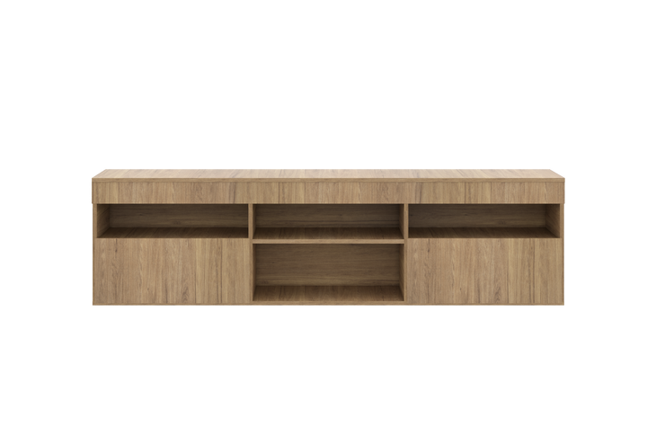 LES + PRODUIT: Meuble TV bas, format large Design moderne et épuré Finition effet bois, rendu chaleureux Plateau supérieur adapté aux grands écrans Niches ouvertes pour box, console et lecteur Espaces de rangement pour livres et objets déco