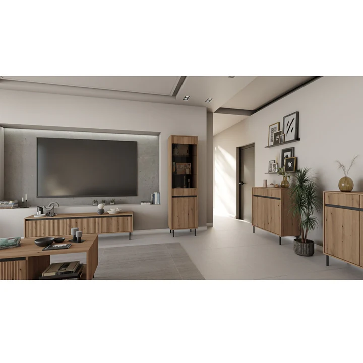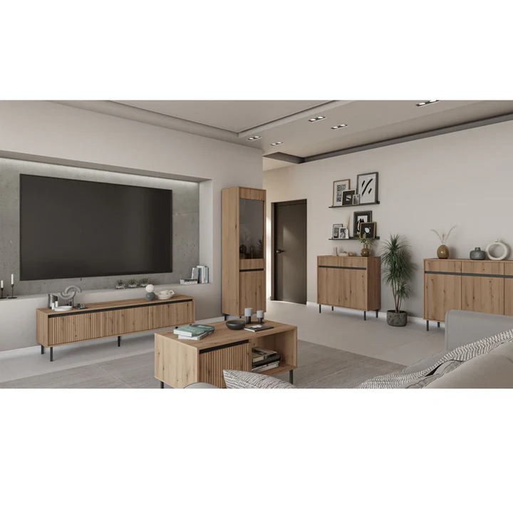 INFORMATIONS COMPLÉMENTAIRES : Pieds en métal Pieds en métal, hauteur : 15 cm 3 tiroirs Coulisses : Roulements à billes Ouverture par poignée Bords protégés par un chant ABS Façades fraisées Fabriqué en Pologne Construction solide et durable Design intemporel