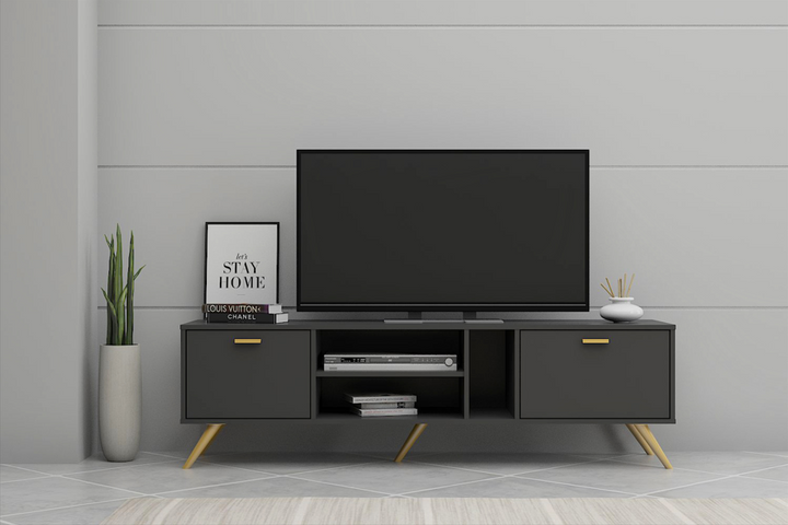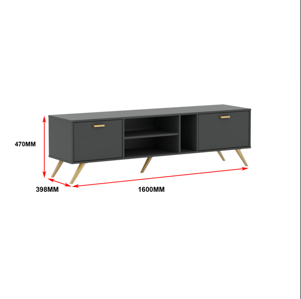 Meuble TV SCANDI / LV19 TV1912MP-DG Structure en panneau de particules mélaminé recouverte de papier décor anthracite / naturel. Dimensions : 160x40xH47cm