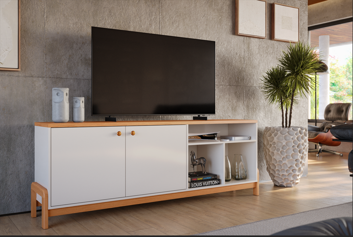 Meuble TV SUNNY / 904277 Plateau MDP 25mm : résistance et maintien pour votre TV et votre décoration ; Espace central pour l’électronique : praticité et organisation dans votre pièce ; Poignées ABS : finition moderne et fonctionnalité au quotidien ; Portes avec charnières à mouvement lent : fermeture douce et silencieuse ; Pieds en bois massif : charme naturel et structure renforcée. Dimensions Hauteur : 69,5 cm Largeur : 183 cm Profondeur : 38,5 cm