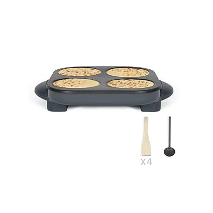 Grâce à ses 4 plaques de cuisson, vous pouvez préparer jusqu’à 4 mini-crêpes simultanément, idéal pour les goûters, petits-déjeuners ou brunchs en famille ou entre amis. Son design gris moderne et compact s’intègre parfaitement à toutes les cuisines et facilite le rangement.