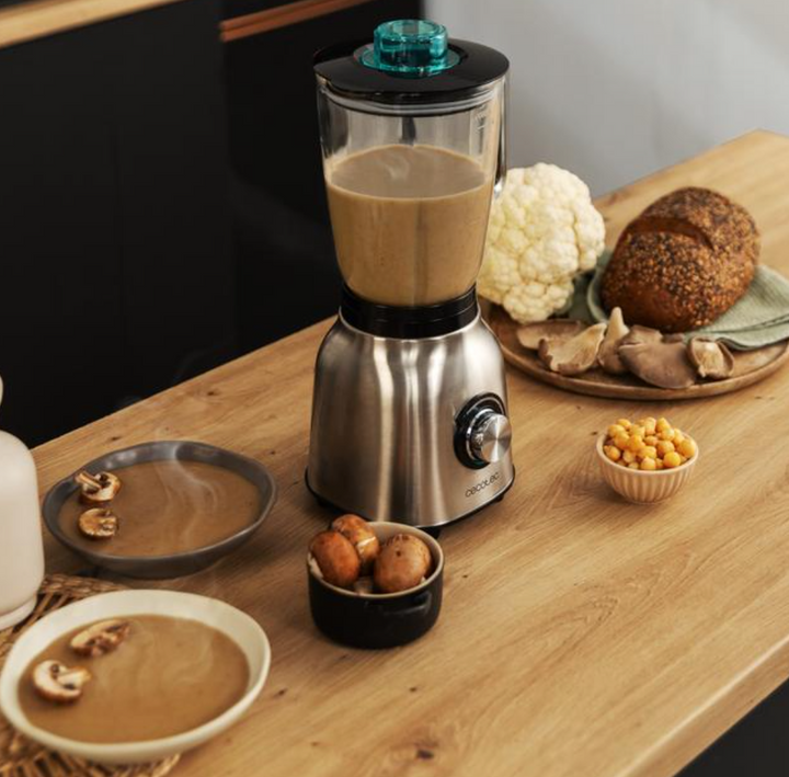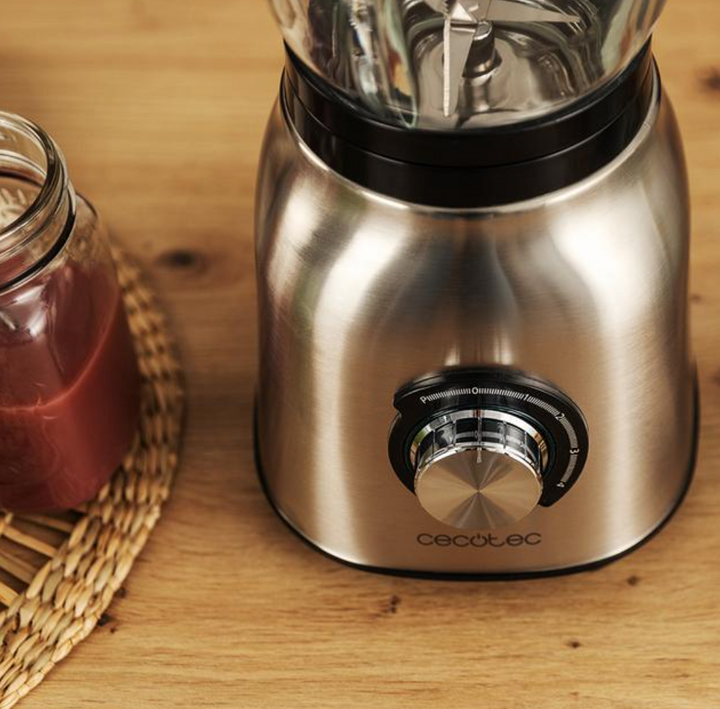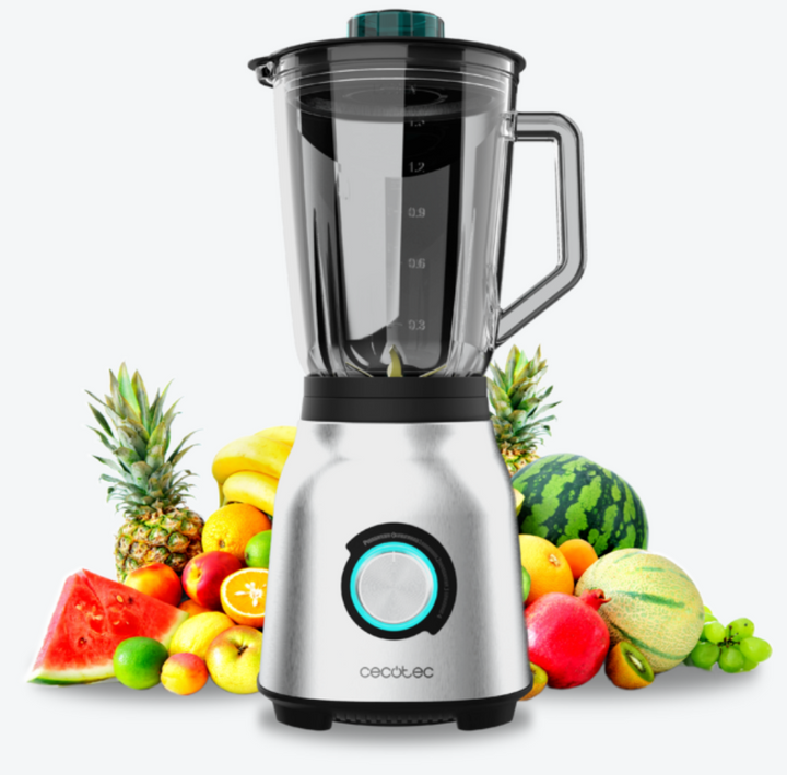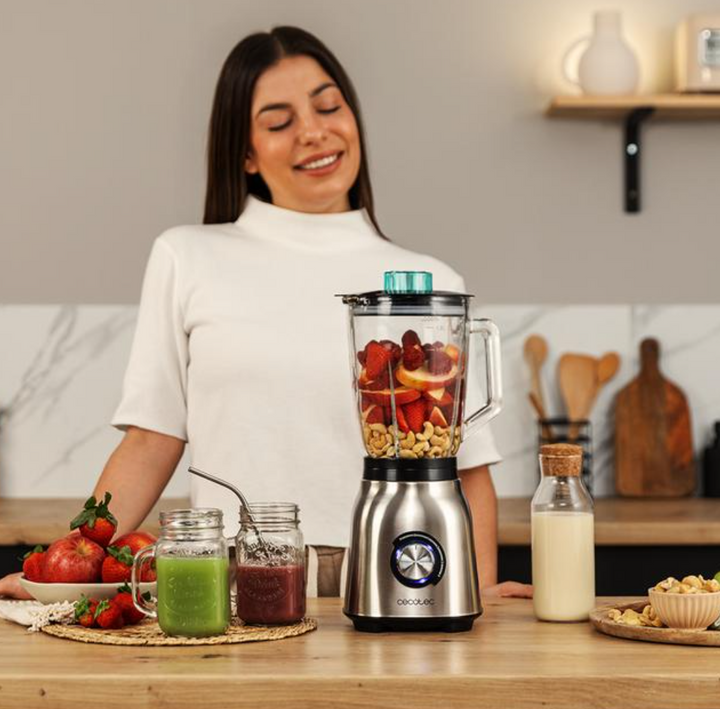 Mixeur-blender de 1800 W / 4382 Mixeur-blender de 1800 W très puissant avec 5 vitesses et 6 lames en acier inoxydable. Il pile la glace et dispose des fonctions Turbo, Smothiee et AutoClean. Mixeur-blender avec finitions en acier inoxydable. Obtenez un broyage optimale avec ses 1800 W de puissance maximale. Bol en verre fondu thermorésistant qui possède une haute résistance contre les impacts. Il possède et 1,5 L de capacité. Il convient pour préparer des élaborations chaudes et froides. Finitions en acier inoxydable. 5 vitesses qui s’adaptent aux besoins de tous les aliments. 6 lames avec revêtement en acier inoxydable, ce qui les rend plus résistantes et plus affûtées pendant plus longtemps. Fonction Turbo pour broyer et pulvériser les aliments les plus durs, y compris la glace, à la vitesse maximale. Fonction Smoothie pour des textures parfaites. Fonction d’auto-nettoyage : ajoutez de l’eau, démarrez le mixeur et il sera parfait automatiquement.