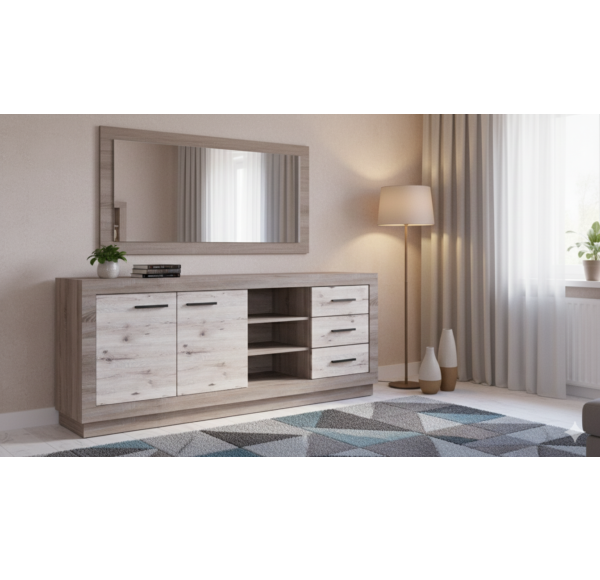 Enfilade PANAMA avec miroir intégré — meuble de rangement élégant et fonctionnel, finitions bois naturelles, idéale pour salon ou entrée. Design contemporain, tiroirs spacieux.