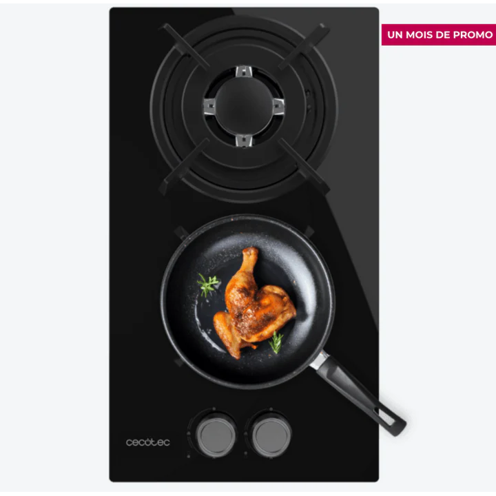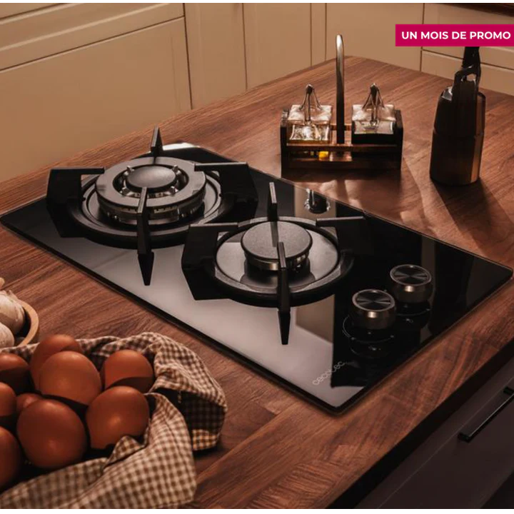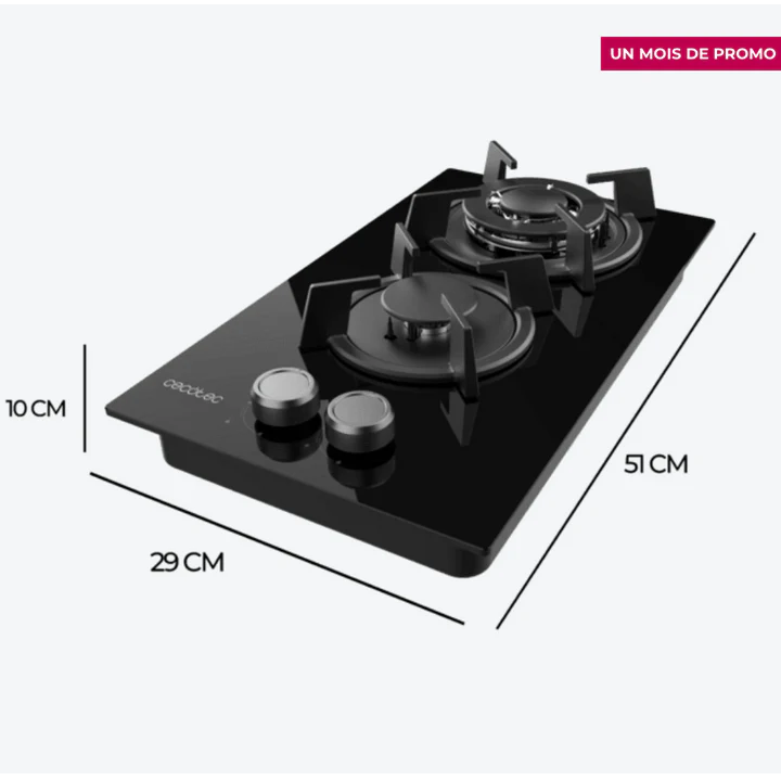 Plaque de cuisson à gaz, 2 foyers, finition en verre noir, grilles individuelles en fonte, puissance de 5250 W, foyer WOK triple anneau, allumage électrique, système de sécurité des valves, gaz naturel avec accessoire de conversion au gaz butane.
