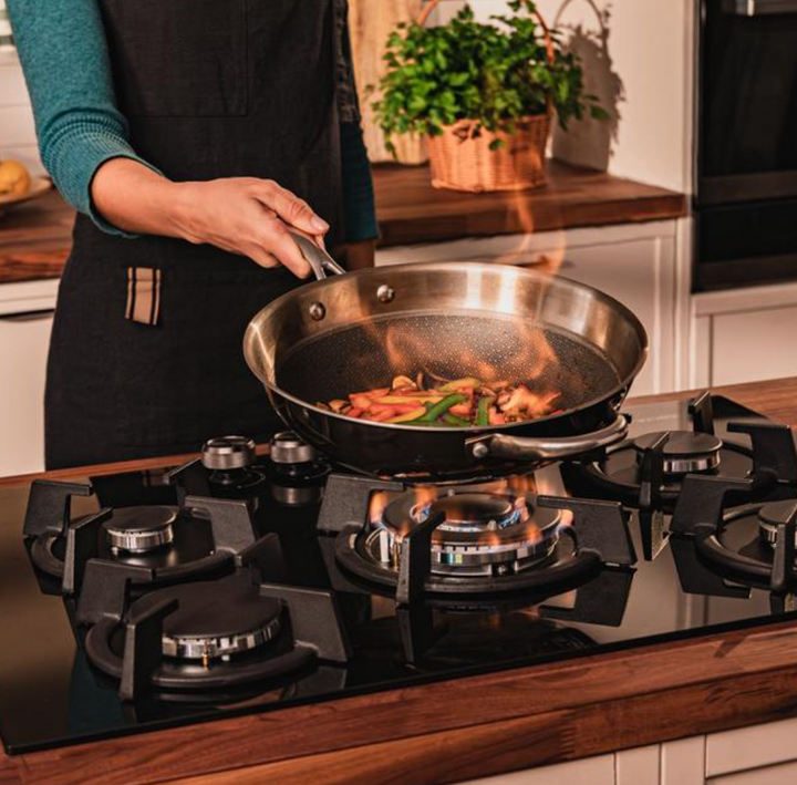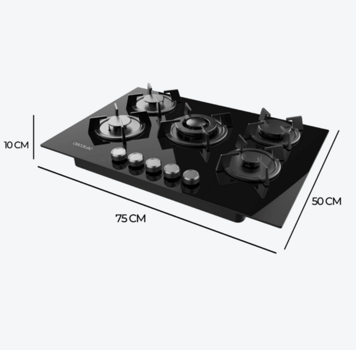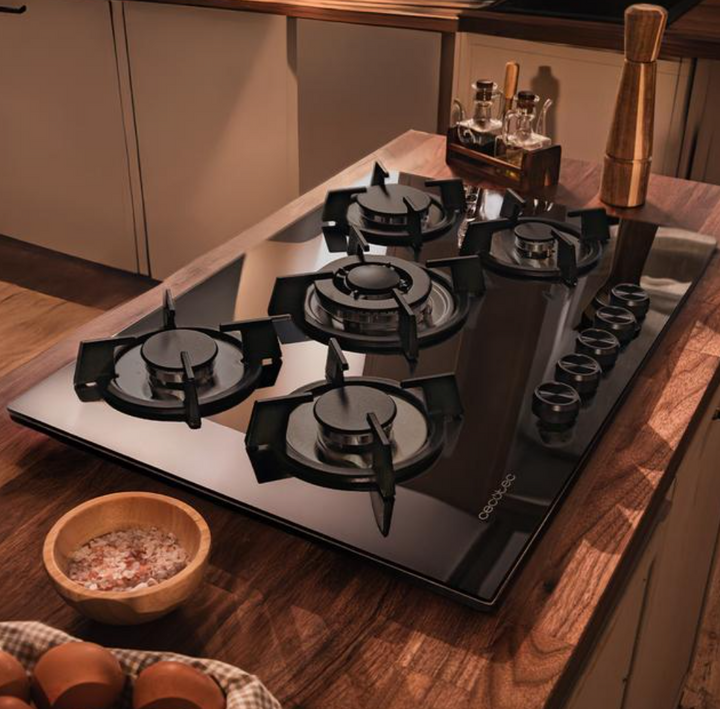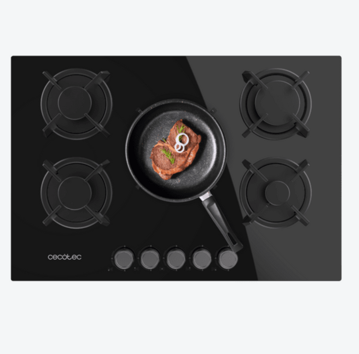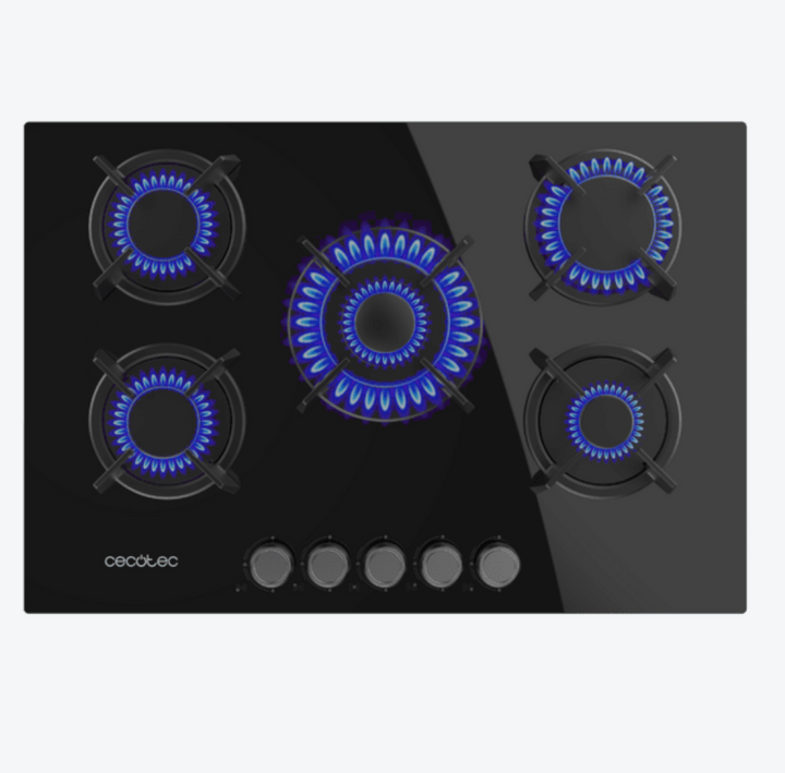 Découvrez une plaque de cuisson à gaz 5 foyers au design élégant, avec surface en verre noir et grilles individuelles circulaires en fonte aux finitions haut de gamme, pensées pour résister à tous les types de cuisson. Elle fonctionne au gaz naturel et est fournie avec un accessoire de conversion au gaz butane pour une installation flexible.