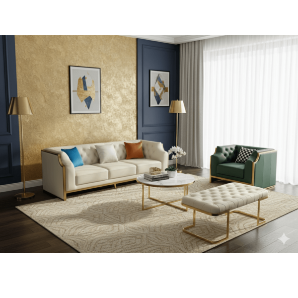 Ensemble salon luxe : fauteuil 1 place (vert), canapé 3 places (blanc) et repose-pieds. Confort raffiné, design chic. Dimensions 180×860×850 mm — réf. 501.