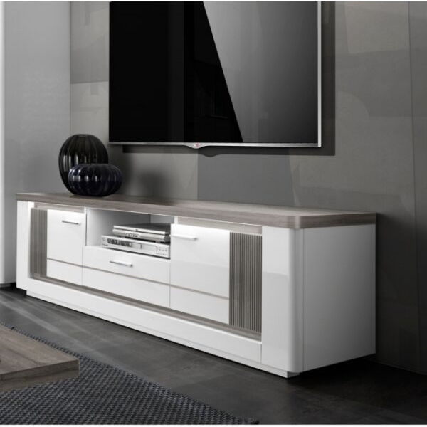 Apportez du style et de la fonctionnalité à votre salon avec la table TV Bellaria, un meuble au design urbain et raffiné, fabriqué avec soin en Italie. Sa finition chêne, gris et blanc apporte une touche moderne et chaleureuse à votre intérieur, idéale pour les ambiances contemporaines. Avec ses dimensions optimisées, elle s’adapte aussi bien aux petits qu’aux grands espaces tout en offrant une excellente capacité de rangement. Dotée de tiroirs pratiques, la table TV Bellaria permet de garder vos télécommandes, câbles et accessoires parfaitement organisés. Son éclairage LED intégré met en valeur le meuble tout en créant une ambiance lumineuse agréable dans votre pièce. Sa structure robuste et ses lignes épurées témoignent d’un savoir-faire italien alliant esthétique et durabilité. Élégante, pratique et résolument tendance, la table TV Bellaria est un choix idéal pour ceux qui recherchent un mobilier aussi fonctionnel que décoratif.