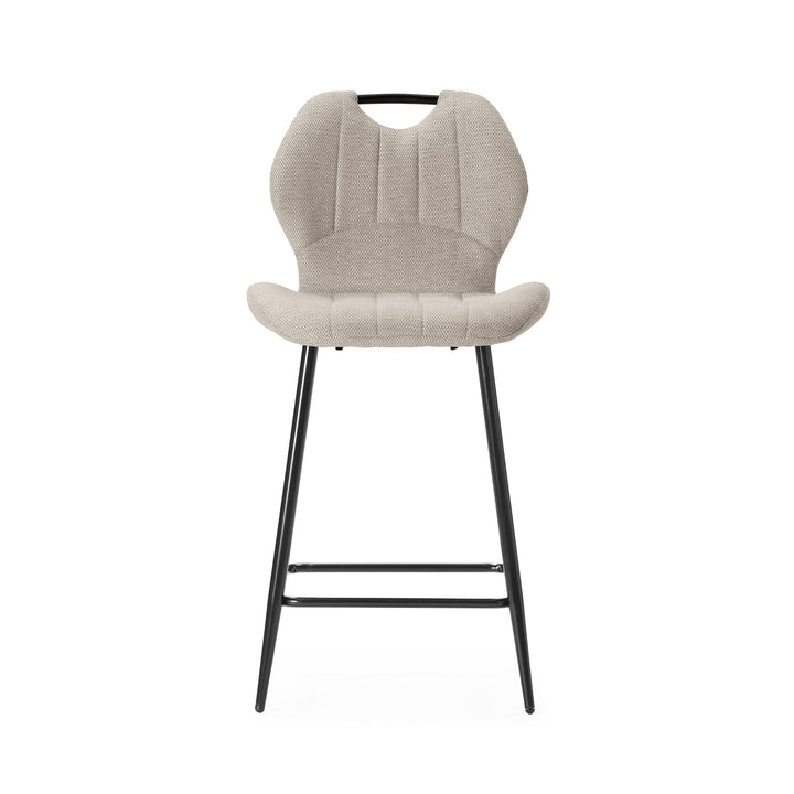 TABOURET MULI BEIGE / 18626 Assise et dossier : Tissu. Piètement en métal laqué noir. Tissu : 100% polyester. Densité du siège : mousse de 28 kg. Densité du dossier : mousse de 20 kg. Dimensions produit : Longueur 48 cm x largeur 51 cm x Hauteur 65/96 cm – Poids net : 5,2 kg. Poids net total : 10,4 kg.