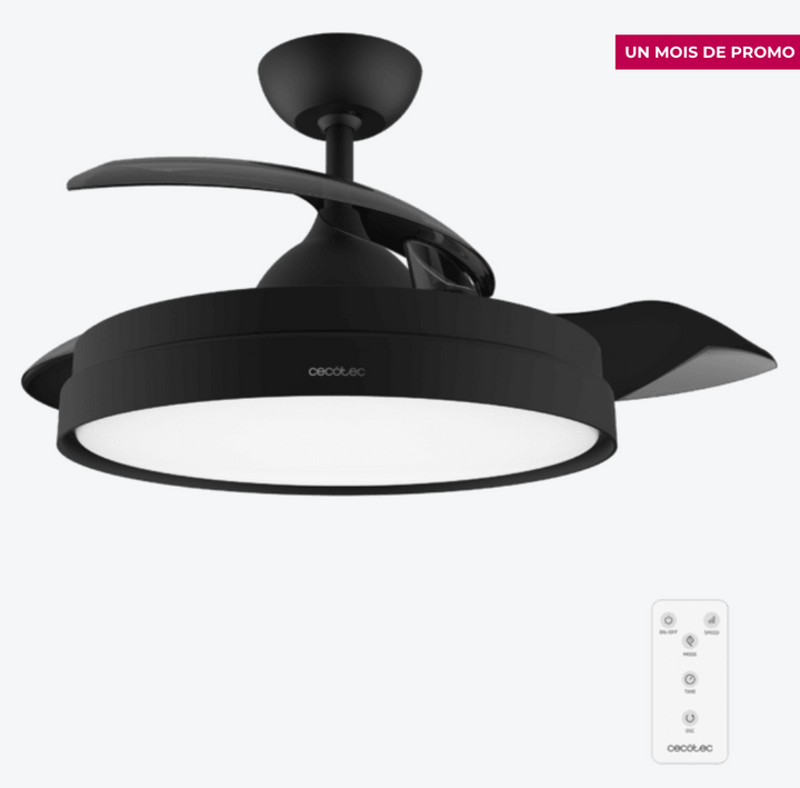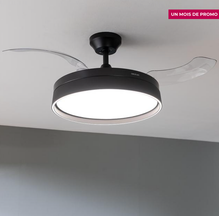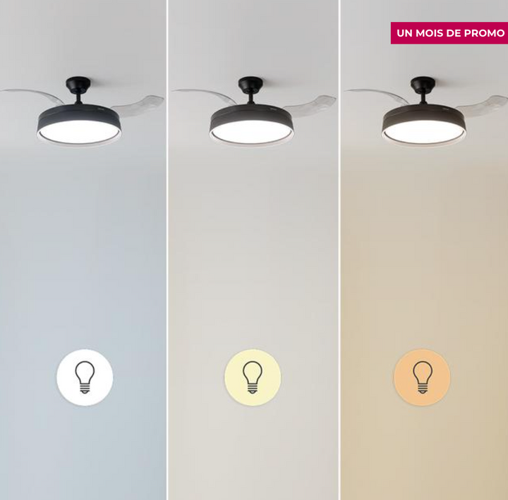 Ce ventilateur de plafond réunit ventilation performante et éclairage raffiné dans une seule unité. Ses pales rétractables se déploient quand vous en avez besoin et disparaissent à volonté pour un look épuré, sans compromettre l’efficacité de la circulation de l’air.