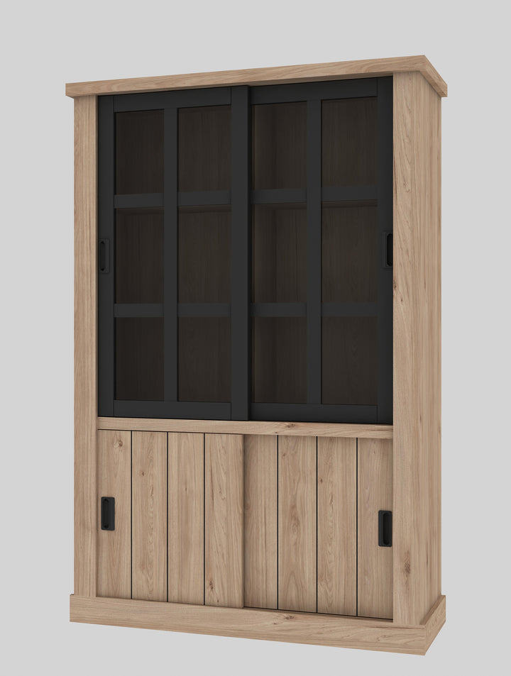 Vitrine JUMBO Structure en panneau de particules, MDF recouvert de papier coloris oak jackson / noir. Dimensions : L 120 x P 45 x H 180 cm